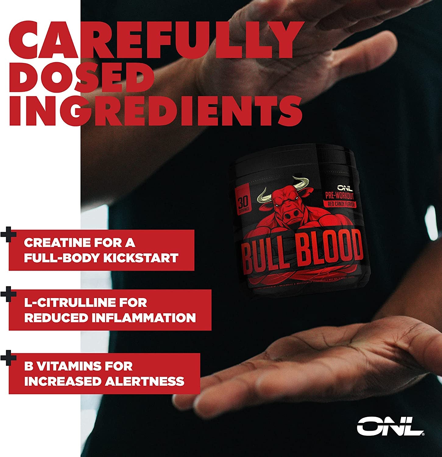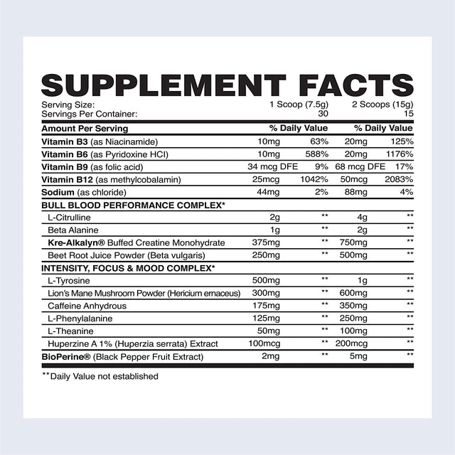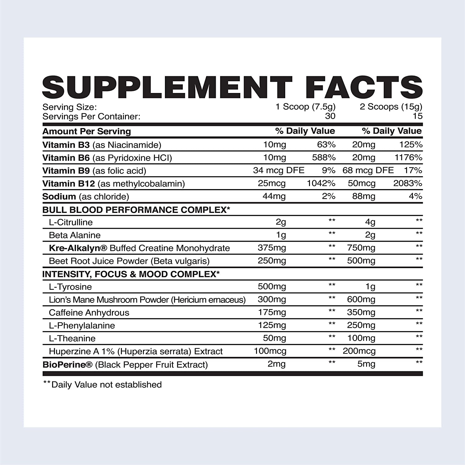 Bull Blood Ultimate Pre Workout - W/ Powerful Nitric Oxide Booster, Creatine & Lion'S Mane - Boost Energy, Focus & Blood Flow – Pre-Workout Supplement for Men and Women - 30 Servings