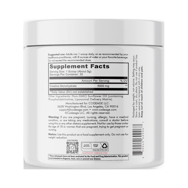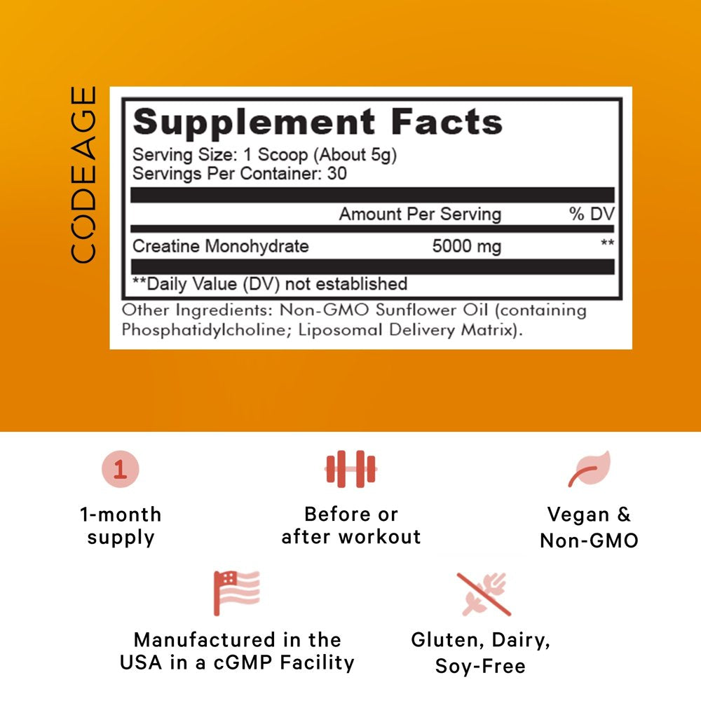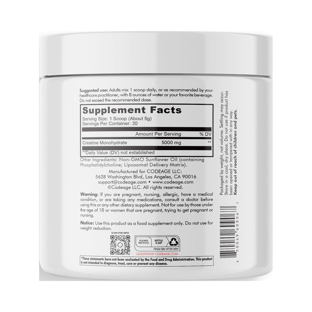 - Codeage Liposomal Creatine powder supplement is formulated to help support your workout performance.* Each serving contains a potent 5000mg dose of micronized creatine monohydrate to promote your training routine, whether it involves high-intensity interval training (HIIT), resistance training, sports, or bodybuilding.*