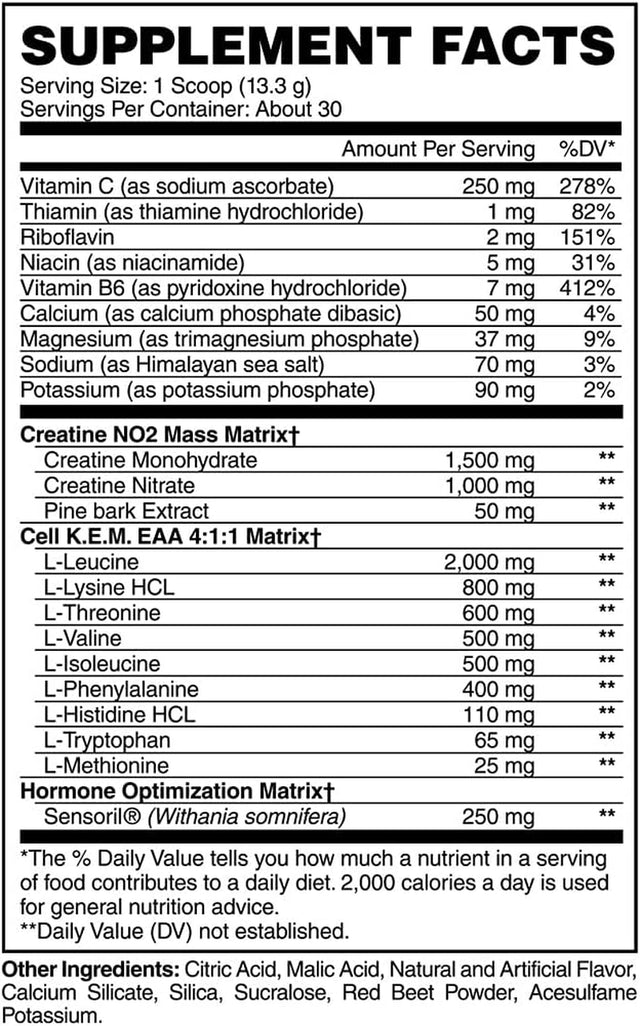 • CREATINE & AMINO ACID MATRIXES – There are two essential components that, when combined, can maximize recovery and muscle growth β€” creatine and amino acids. The precise formula found in CellKEM utilizes BCAAs in the recommended 4:1:1 ratio, EAAs, patented NO3T Creatine Nitrate, and creatine monohydrate. The powerful combination of matrixes can improve recovery, boost strength, enhance muscle growth, and increase nitric oxide levels to improve blood flow to support muscle fullness.