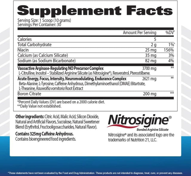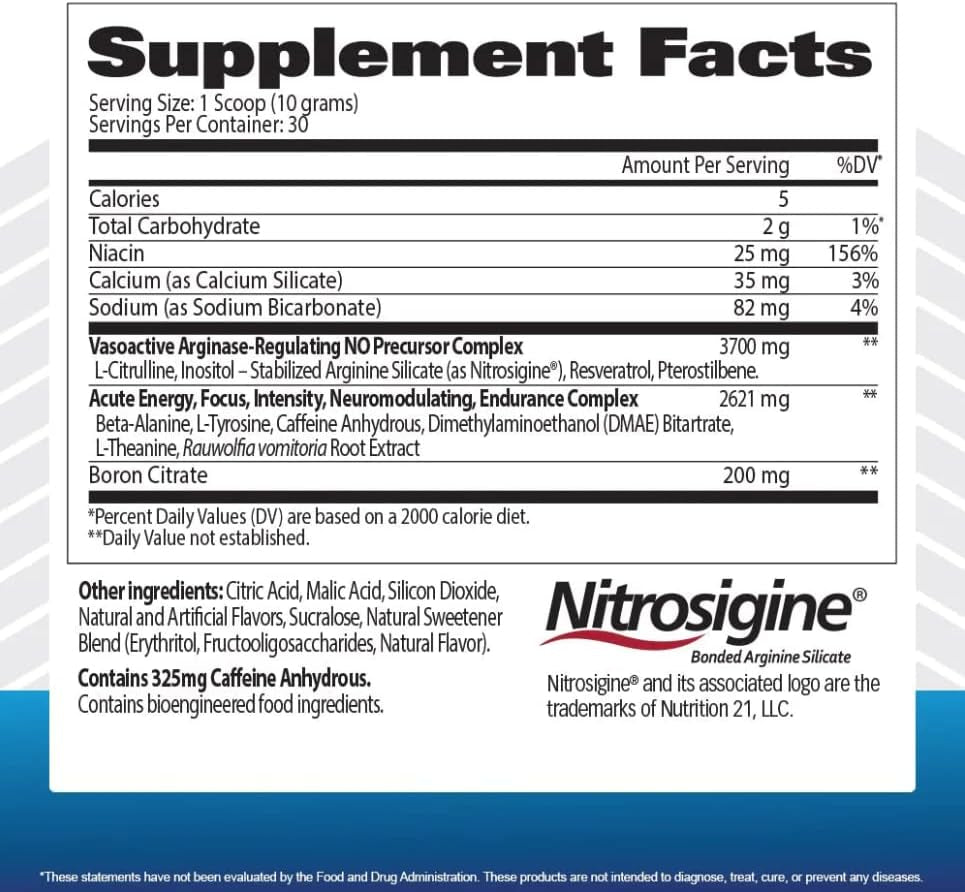 • This new formula boasts Nitrosigine as its only source of Arginine. Nitrosigine has been shown to inhibit the enzyme responsible for breaking down Arginine, making it the superior choice of arginine supplementation and a perfect synergistic partner to L-Citrulline.