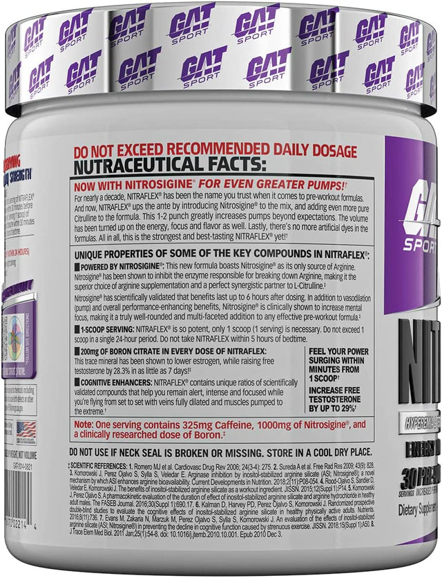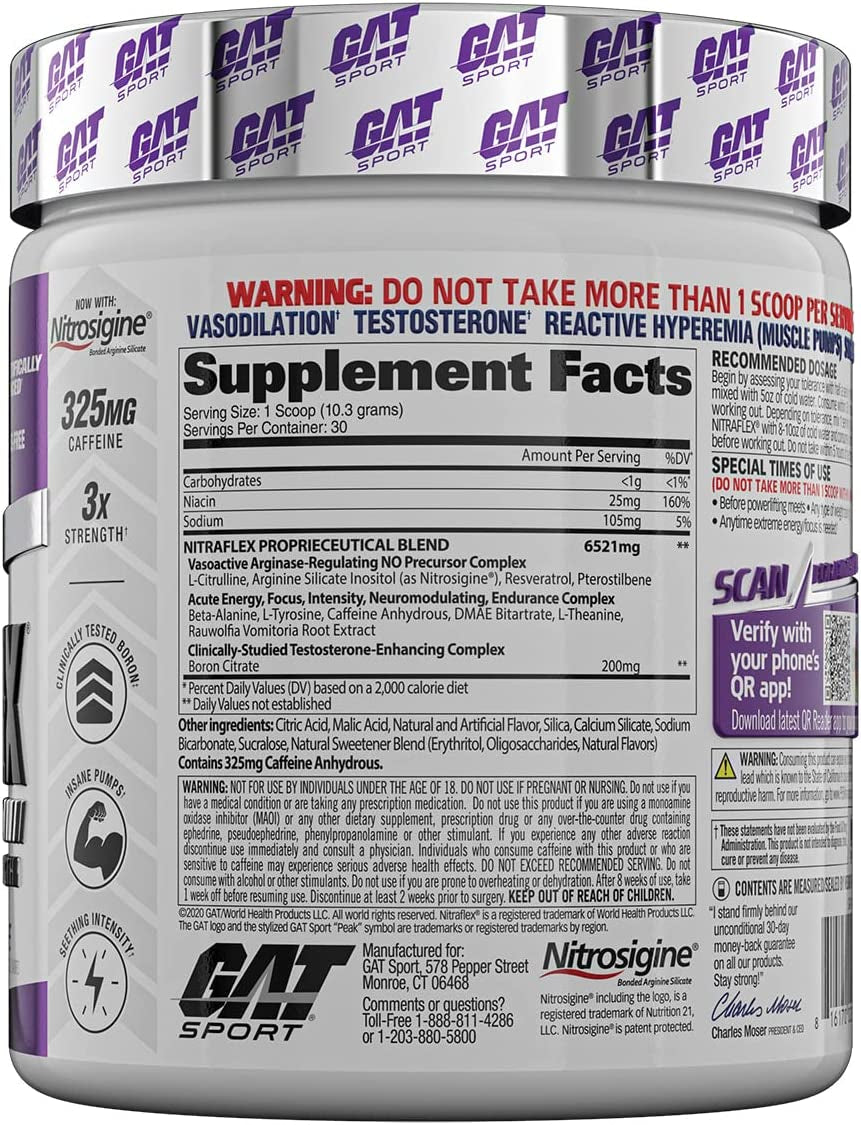 GAT SPORT, Nitraflex Advanced Pre-Workout Powder, Increases Blood Flow, Boosts Strength and Energy, Improves Exercise Performance, Creatine-Free (Grape, 30 Servings)