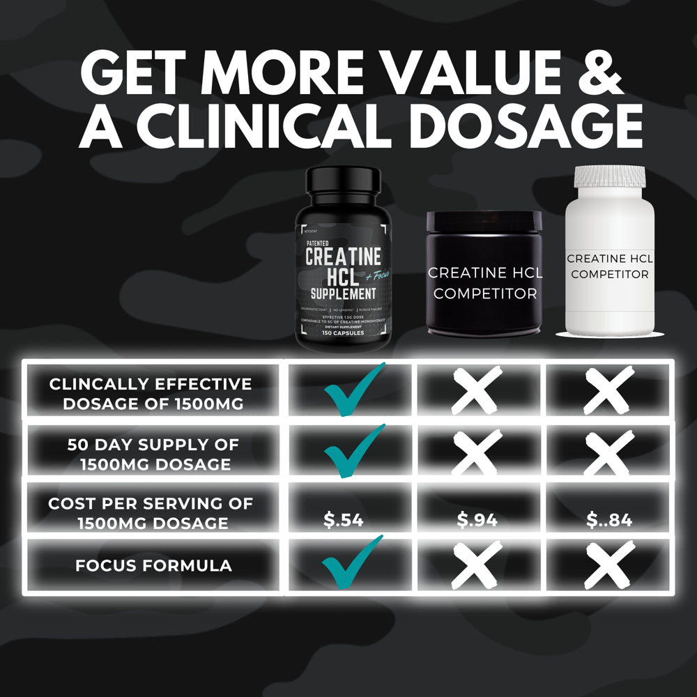 - CLINICAL DOSAGE POTENCY: The recommended scientifically studied dosage for creatine hydrochloride is 1.5G - 2G to support muscle size, strength, and power.