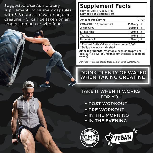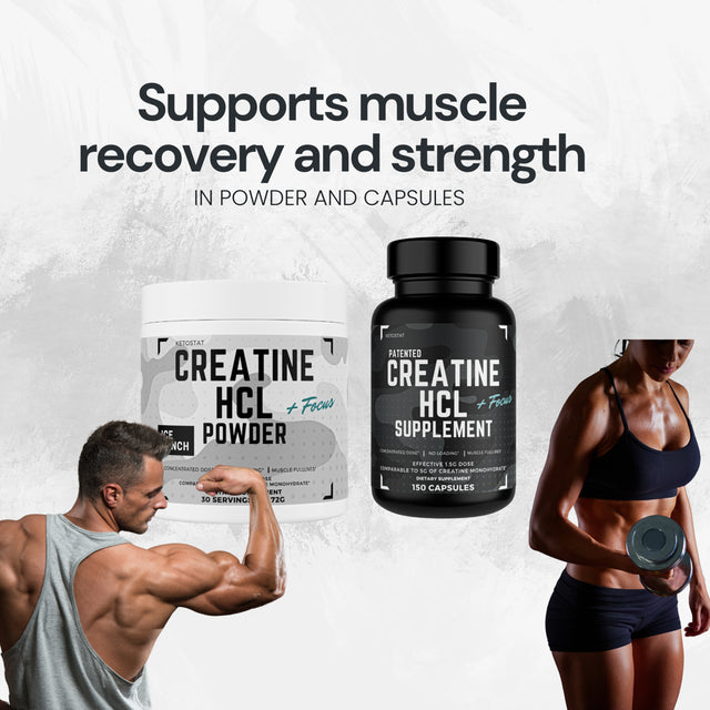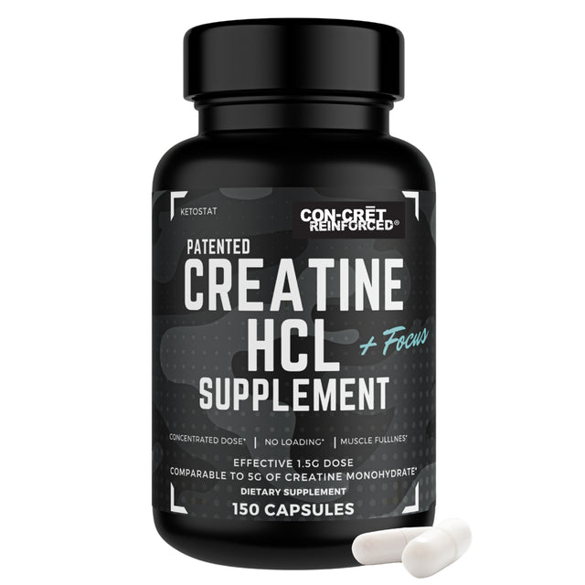Ketostat Patented Creatine Hydrochloride Capsules delivers a 1.5G clinical dosage of creatine to help support lean muscle growth and muscle energy production.* Creatine HCL is a dietary supplement of a naturally occurring amino acid that is stored in the muscles and supports energy for exercise. Made with CON-CRET Patented Creatine HCl®, it is more soluble and bioavailable. Creatine HCL is a perfect solution to a creatine monohydrate with no loading phase which reduces water retention and uncomfortable bloating.* Focus ingredients provide mental clarity, focus, and memory.* Perfect for bodybuilding, endurance athletes, all sports, weightlifting, and powerlifting. Produced with strict quality guidelines and is backed by our quality guarantee. Use daily and consistently over time and combined with exercise supports muscle building, recovery, performance, strength and power.