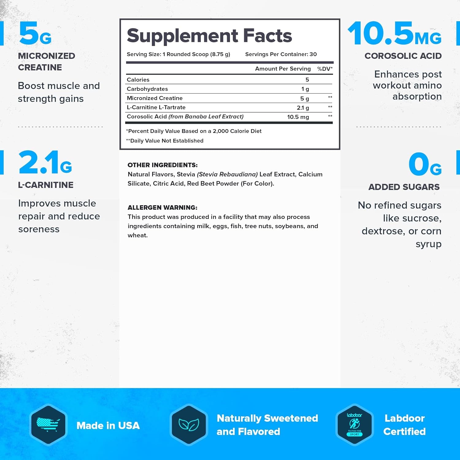 • HELPS BOOST MUSCLE & MAINTAIN STRENGTH. With this post workout recovery drink, you're going to have the support that you need while trying to gain muscle and maintain strength after very workout thanks to creatine powder and L carnitine L tartrate.
