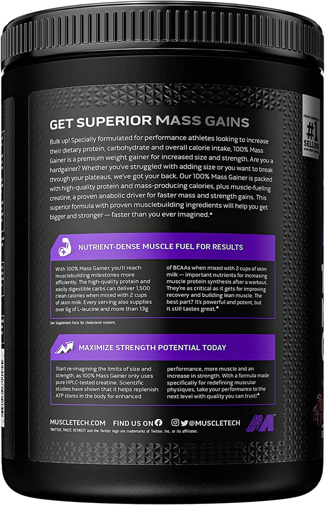 - SUPERIOR WEIGHT GAINER – MuscleTech 100% Mass Gainer is packed with high-quality protein and mass-producing calories, plus muscle builder creatine monohydrate, a proven anabolic driver for faster mass and strength gains. This superior formula will help you get bigger and stronger