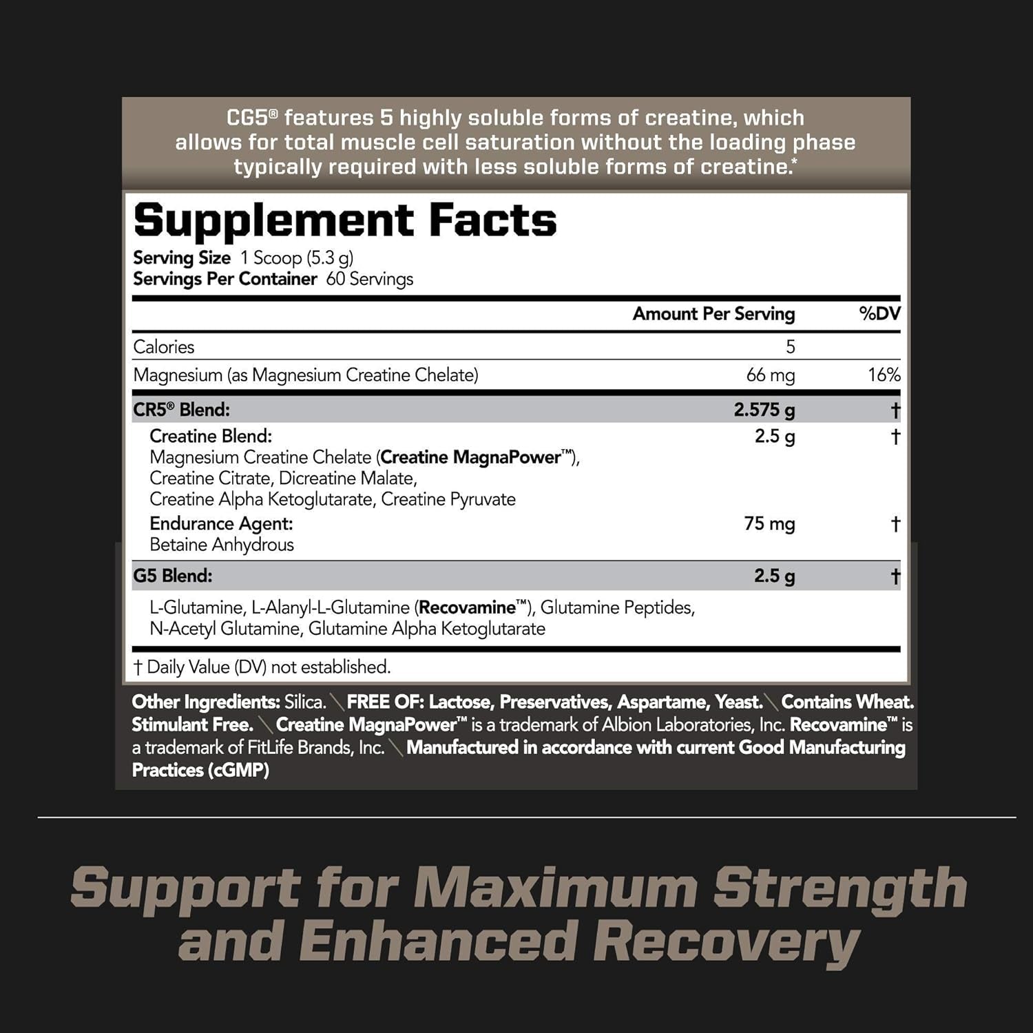 - Powerful Strength: CG5 features a blend of 5 different forms of Creatine, and is specifically formulated without creatine monohydrate. It does, however, include clinically studied Creatine MagnaPower, an advanced form of creatine that binds creatine to magnesium, making it less susceptible to breakdown in the stomach. By including MagnaPower, CG5 helps to maximize overall creatine uptake into the body.