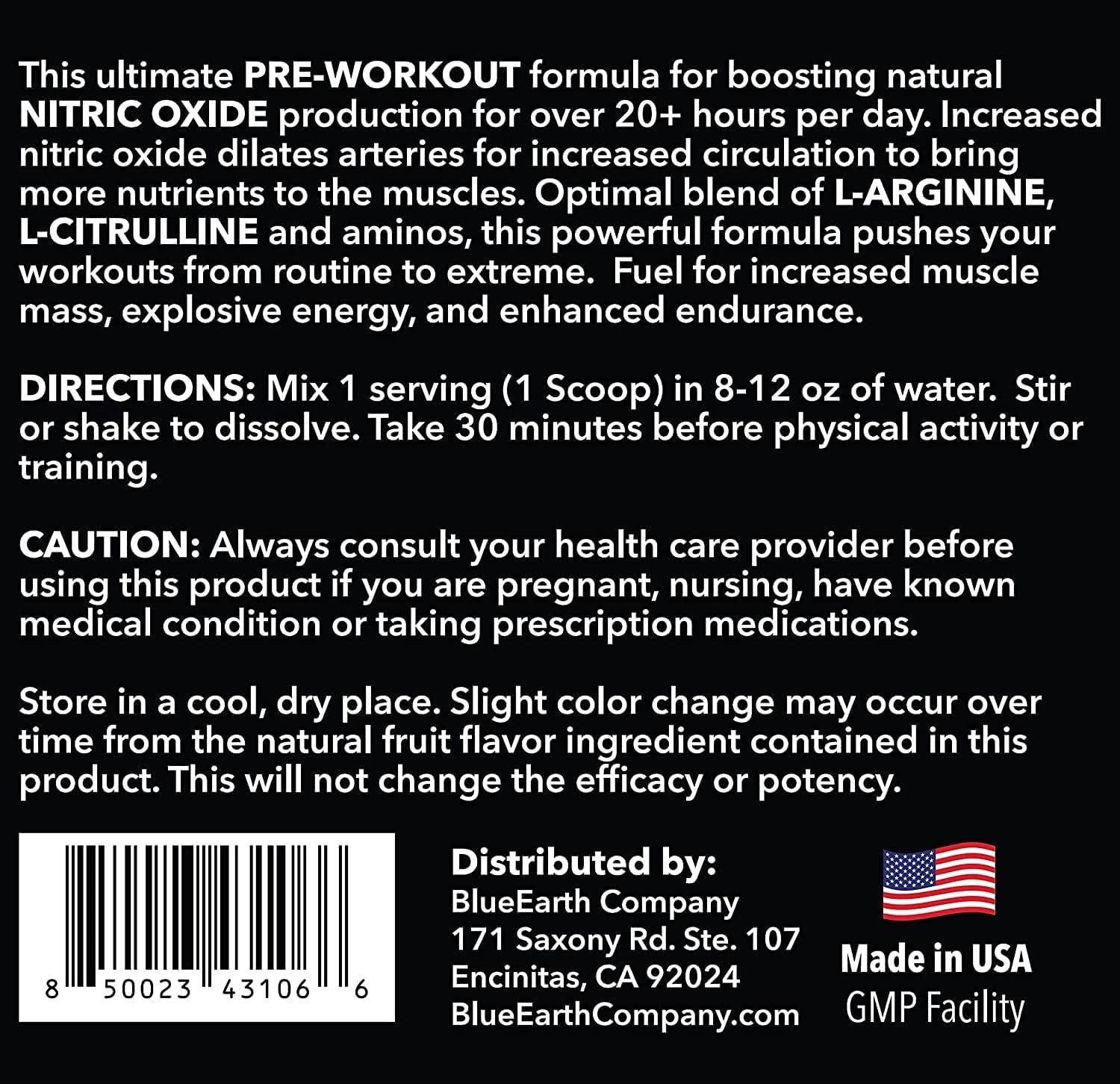 • This Nitric Oxide booster pre-workout powder for boosting natural Nitric Oxide production for 20+ hours per day. Optimal blend of L-Arginine 5000mg and L-Citrulline 1000mg for maximum NO release along with Creatine Monohydrate 2000mg, Beta Alanine 1000mg and Caffeine 200mg. This powerful formula pushes your workouts from routine to extreme. Fuel for increased muscle mass, explosive energy, focus, endurance and increased circulation.