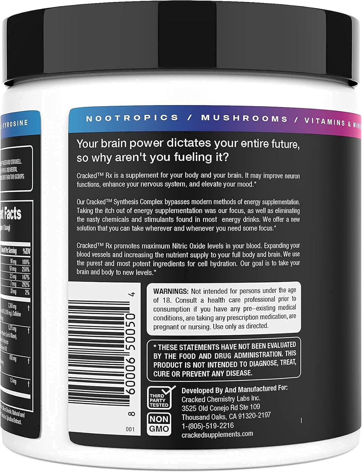 Rx Nootropic Energy Focus Endurance Powder Drink without Beta Alanine Free No Itch Natural Pre-Workout (Fruiting Body Mushrooms, Ashwagandha, Creatine HCL, Vitamins & Dopamine Boost)