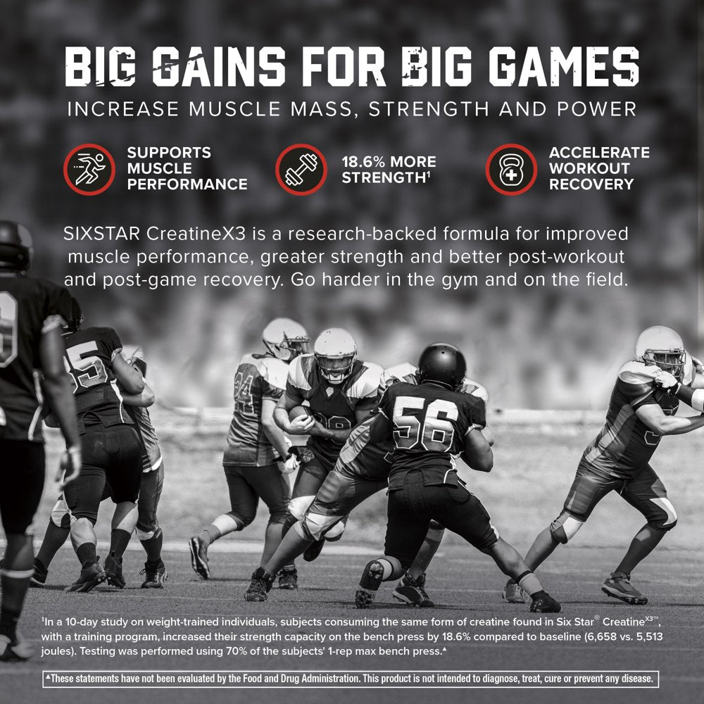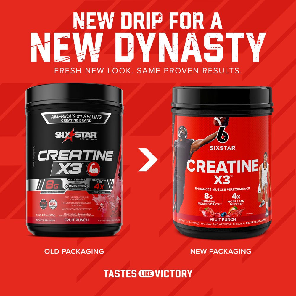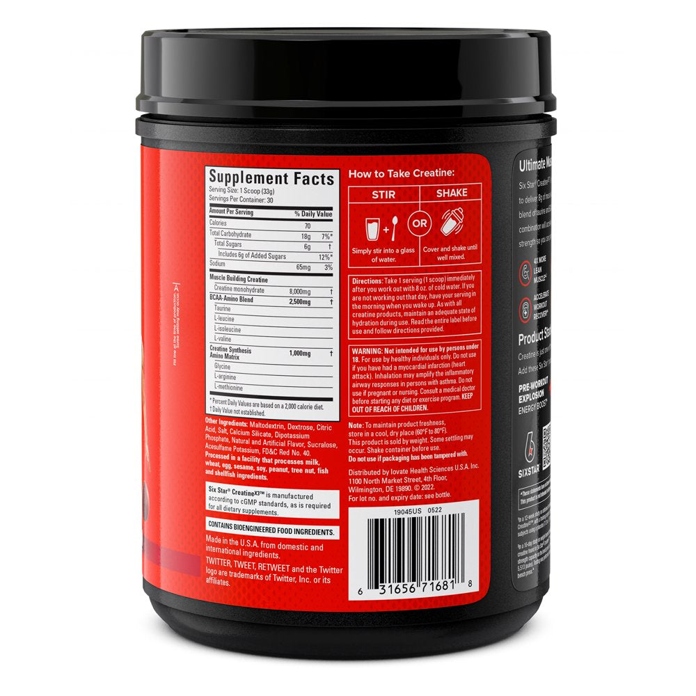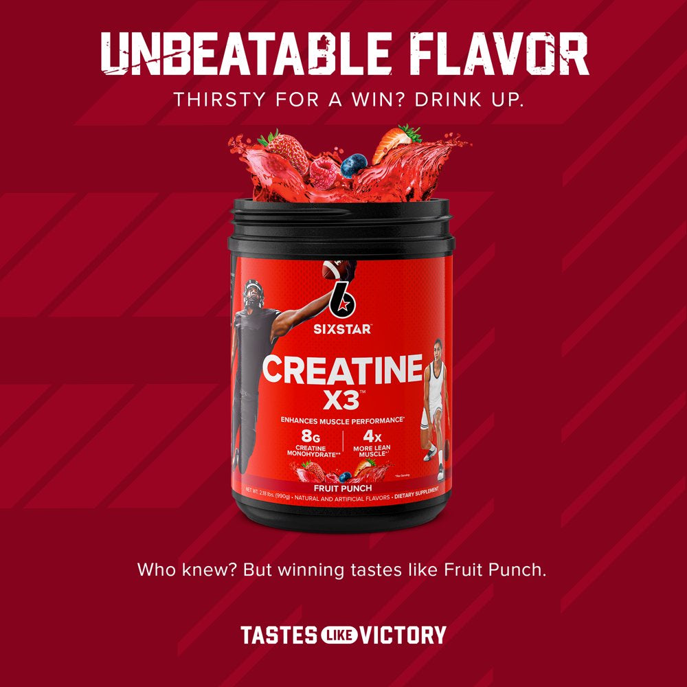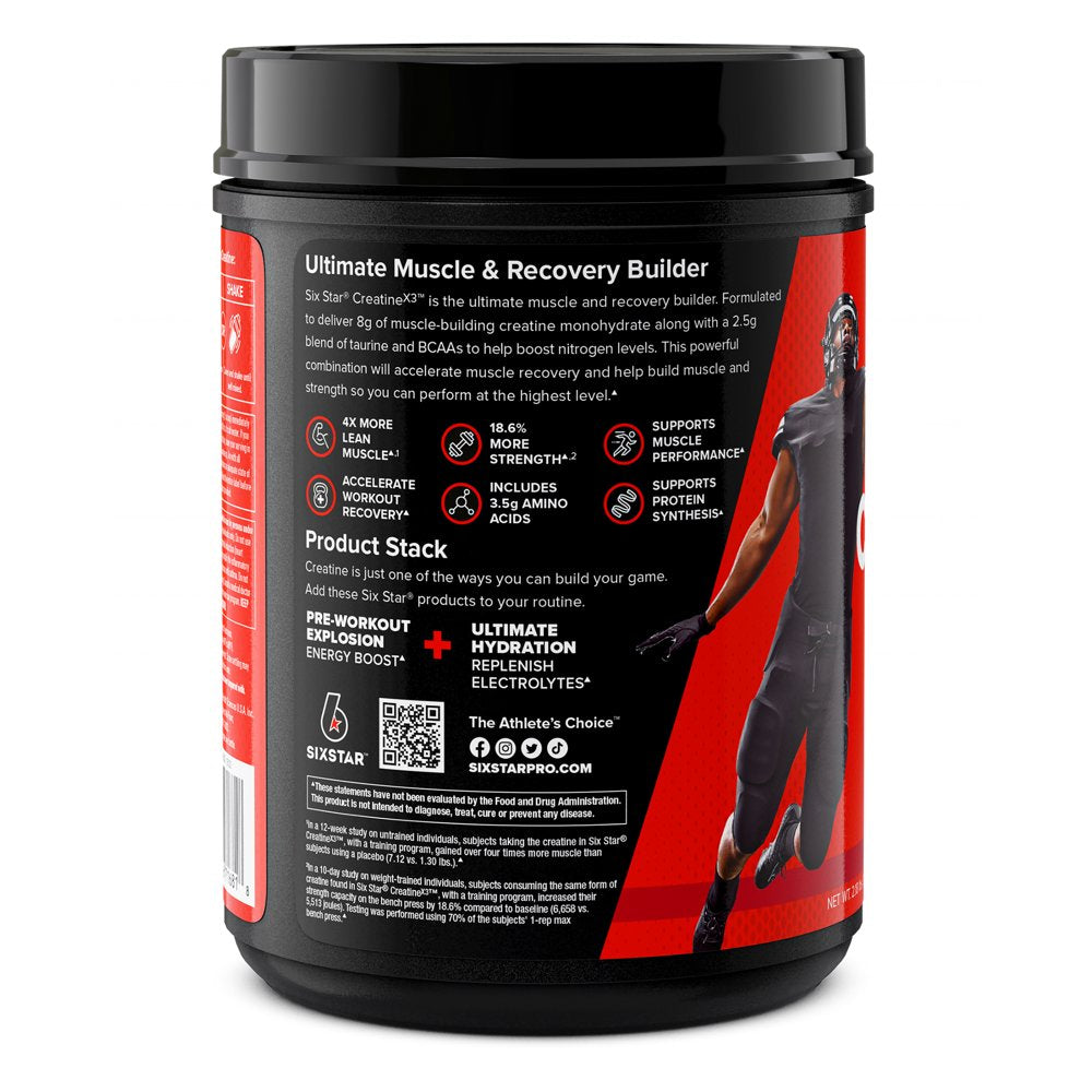 Six Star Pro Nutrition Creatine X3 Fruit Punch Powder is formulated to delivery 8g of muscle building creatine, along with 2.5g of BCAAs and taurine to help boost nitrogen levels. The fuel you need to. Build muscle and strength, and it’s engineered for all athletes. Every scoop delivers 8g of premium creatine monohydrate and creatine HCl. In a 12-week study, those who consumed the creatine in Creatine X3 and taking part in the training program gained over 4X more lean muscle compared to placebo. When used continuously, Creatine X3 saturates your muscles, improving your between-set recovery and enabling you to train harder, for longer periods of time.