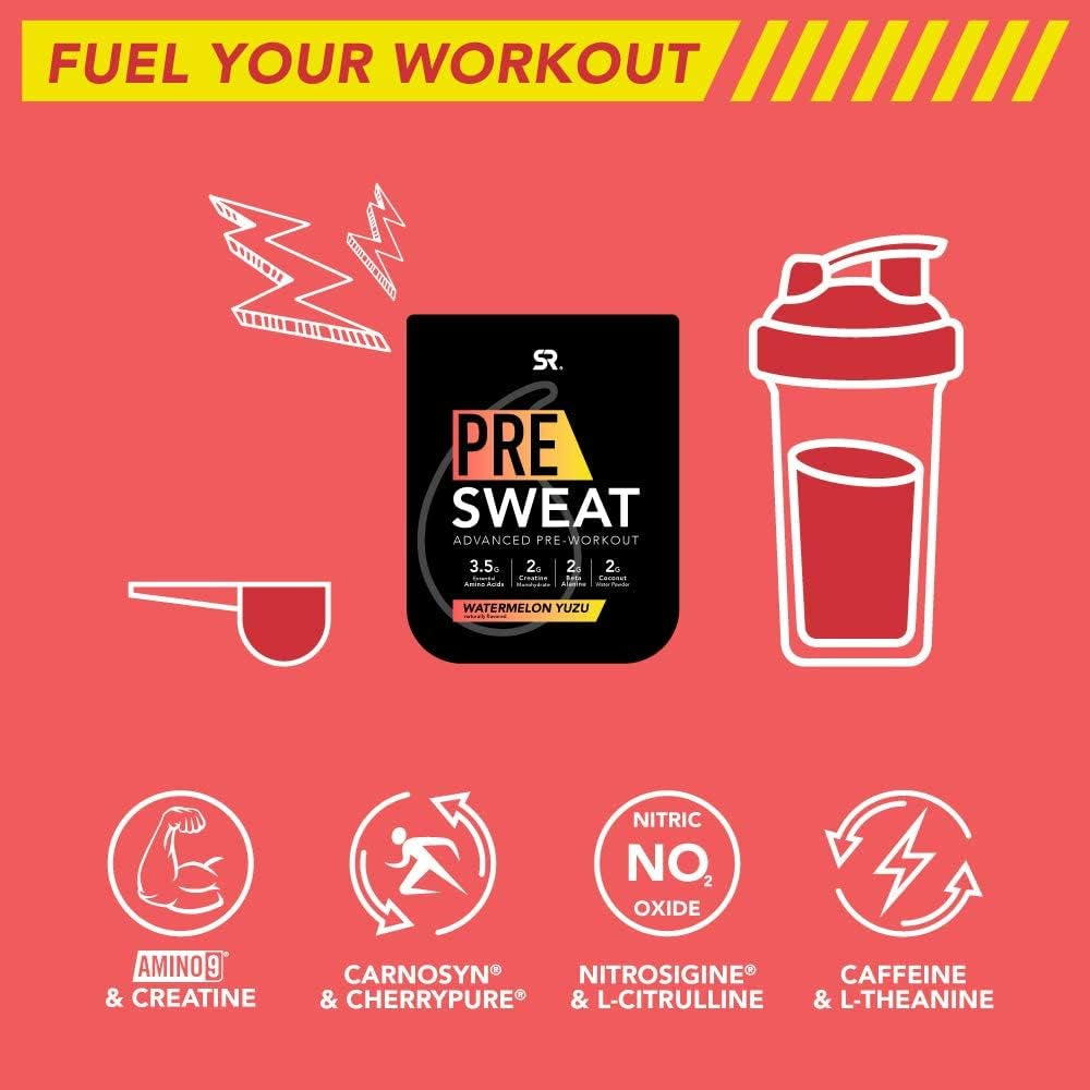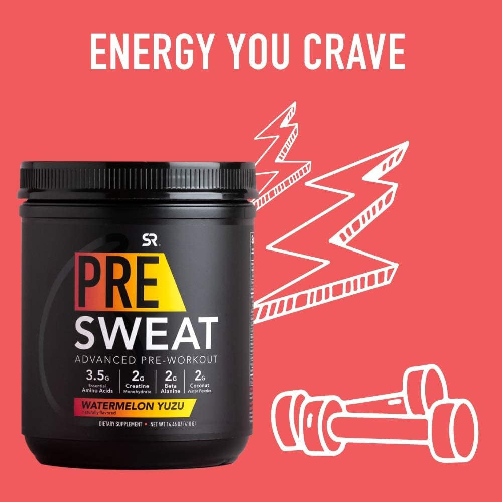 Sports Research Presweat Advanced Pre-Workout Energy Powder | 9 Essential Amino Acids, Organic Caffeine + L-Theanine, Creatine, Beta-Alanine, Acetyl- L-Carnitine, Tart Cherry (Watermelon Yuzu) 14.46Oz is backordered and will ship as soon as it is back in stock.