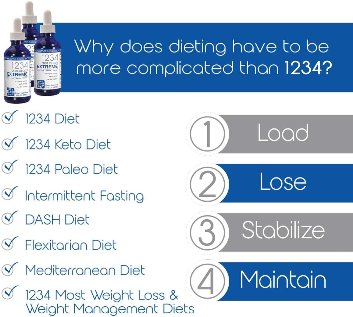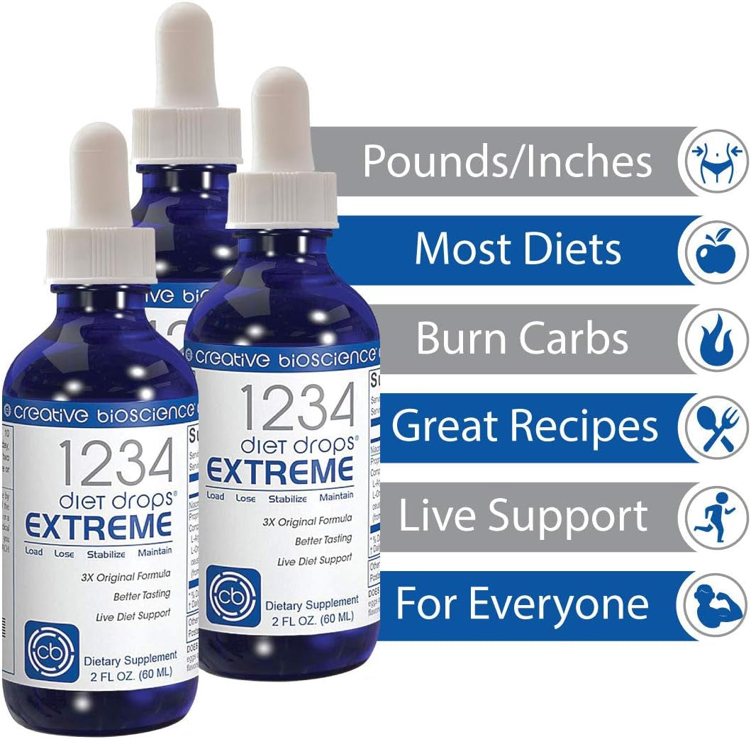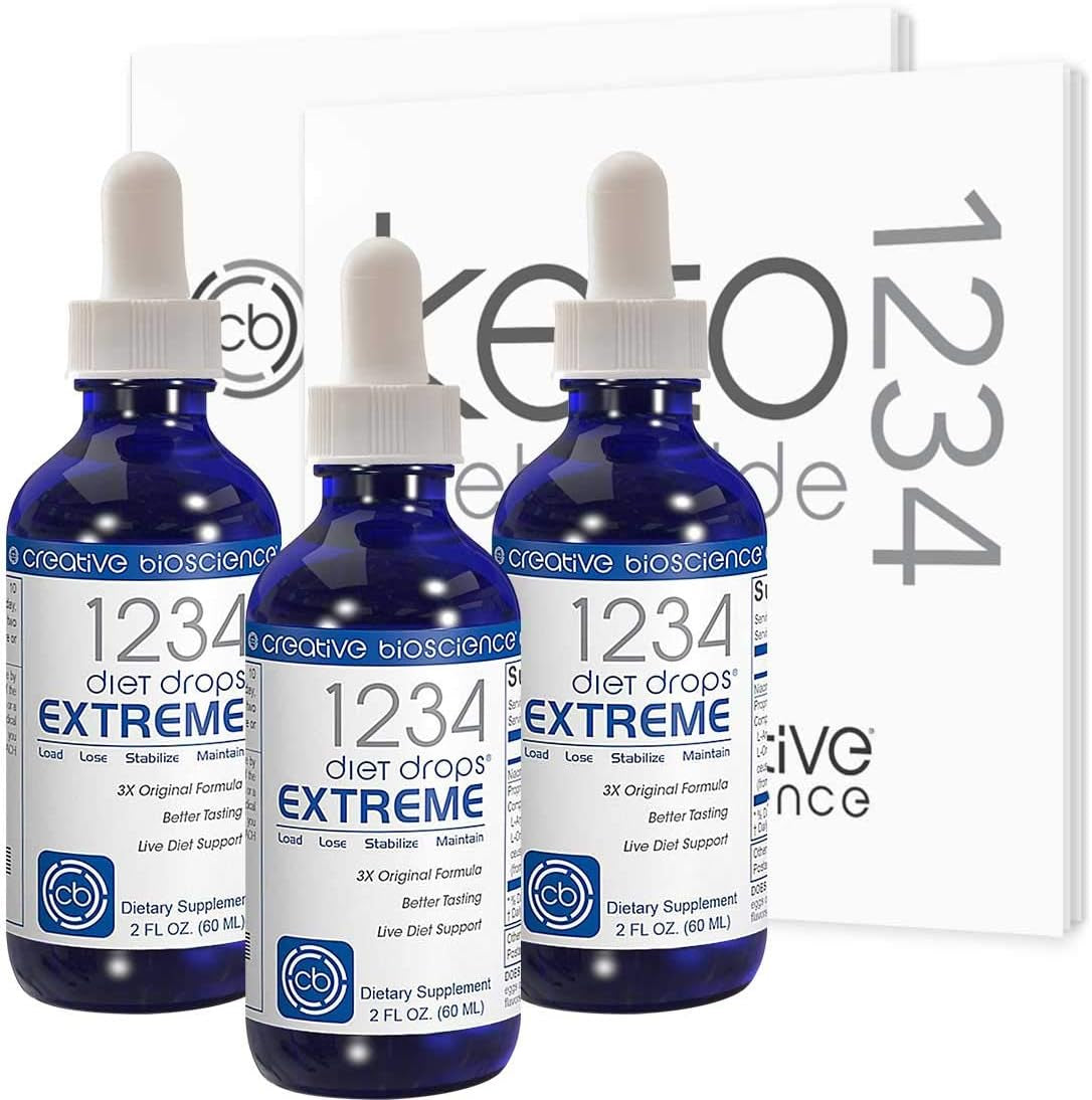 1234 Diet Drops EXTREME 2 Fl Oz (3 Pack). Premium diet drops made from a complex of amino acids, various roots, niacin and other natural ingredients are perfectly aged & blended in the USA. Since 2010, Creative Bioscience has innovated the diet world with premium diet drops designed for weight management (loss); in conjunction with the signature of 1234 (1 Load) (2 Lose) (3 Stabilize) (4 Maintain). 1234 Diet Guides with higher caloric intake availability are included in each package for a simple breakdown of complicated diets. The 1234 Diet Guides include suggested foods, eating times, portion suggestions, progress charts, great recipes and 24-7 expert diet support. 1234 diet drops & 1234 guides have been used by millions in over 80 countries, won several awards and placed #1 Selling Brand in the Spins Top-line Data Report for diet in Natural Foods. The 1234 Diet Guide includes Spanish Instructions Try the new Keto Diet 1234 Guide now included with our products for a change of pace. 1234 Diet Drops for women and men have been used by (IF) Intermittent fasting dieters before it became popular.*