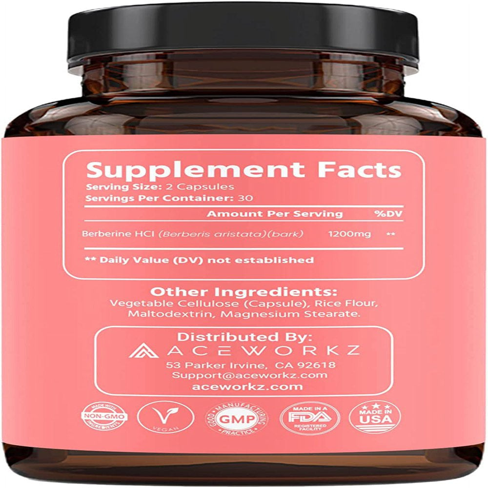 ACEWORKZ Premium Berberine HCL 1200Mg - 97% Tested Purity - Blood Sugar, Weight Management, Cardiovascular, Immune Support Supplement