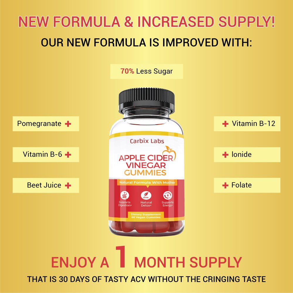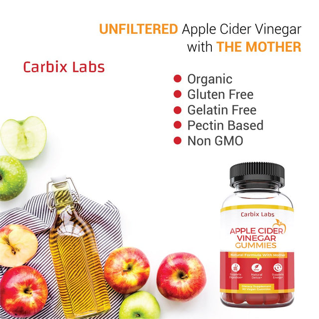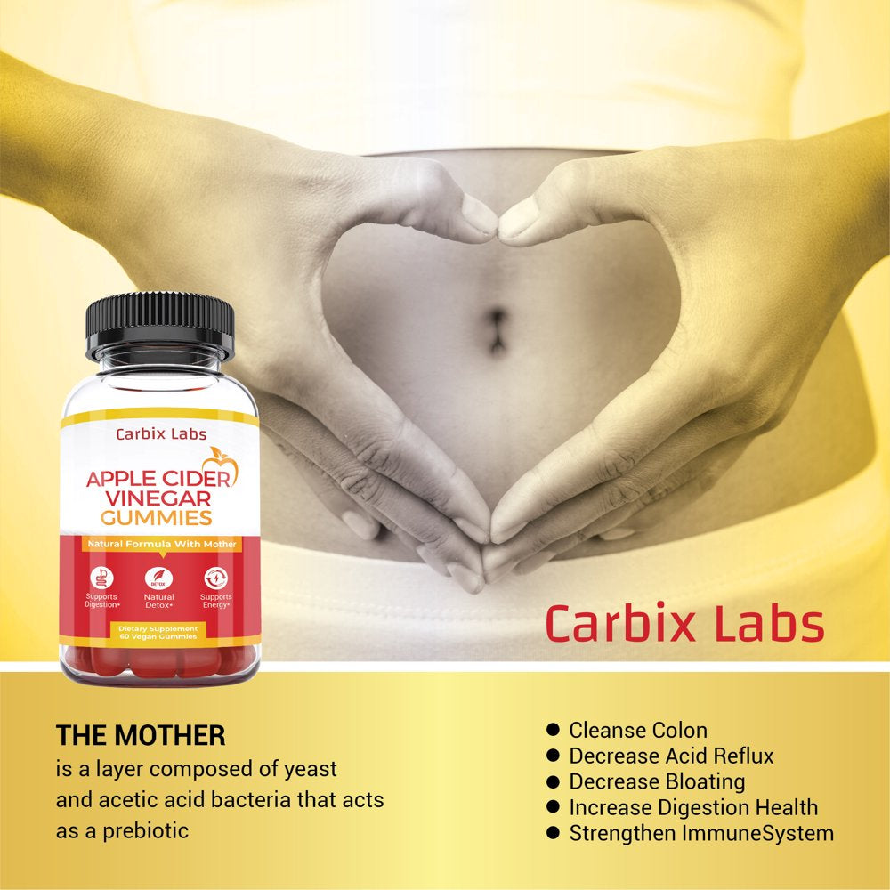 - MADE WITH THE MOTHER: Each bottle of Carbix Labs Apple Cider Vinegar Gummies contains the highest quality of apple cider vinegar made from real apples. Our gummies also contain "the mother" to maintain the health boosting benefits and probiotics.