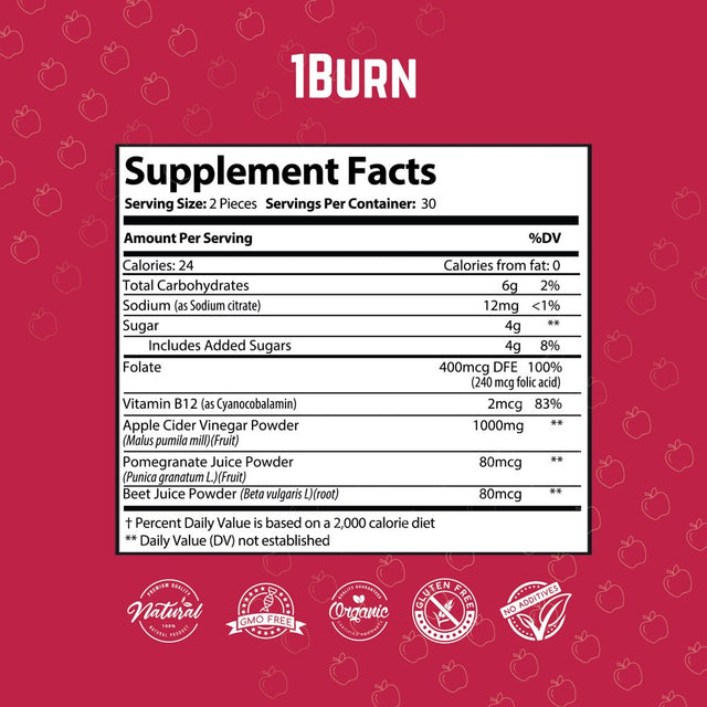 - INCREASE ENERGY LEVEL: Formulated with pomegranate and beet juice powder, Ionide, Folate, Vitamin B-6 & B-12 to help you feel energized & refreshed. 1Burn Apple Cider Vinegar gummies promotes improved energy levels and overall health, supporting a thorough cleanse of the body and keeping you feeling refreshed!
