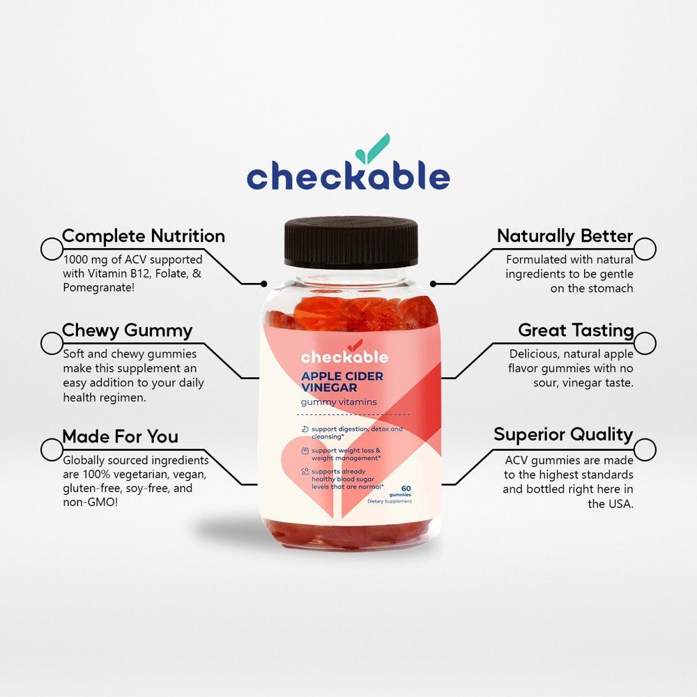 Checkable® Apple Cider Vinegar Gummies - Support for Weight Management, Digestion, Gut Health, Detoxing, and More - Vegan, Gluten-Free, Non-Gmo Formula - 180 Gummies