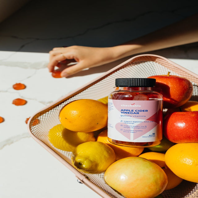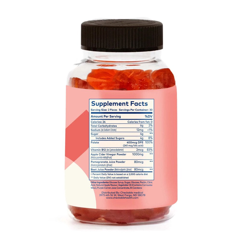 Apple Cider Vinegar Gummies from Checkable® are a detox and weight management favorite made delicious. Apple cider vinegar has been popular for internal cleansing and diet support for decades but now you can enjoy its benefits without the vinegar flavor. Checkable® gummies are vegan-friendly and gluten free. Each two-gummy serving delivers 100% of your daily folate needs along with a potent dose of energizing B12 and 1,000 mg apple cider vinegar for gut and digestive health.