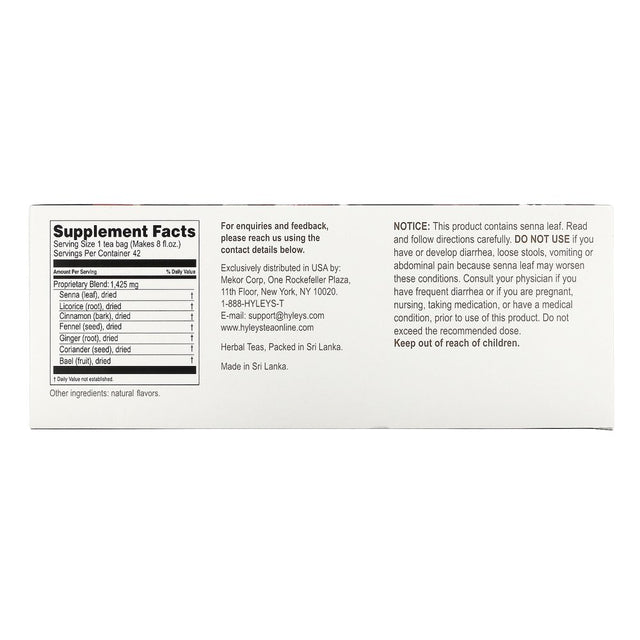 Hyleys Colon Cleanse Teas combine the prowess of natural herbs to support a vibrant digestive system. Crafted after rigorous research, each tea bag contains a potent mix of senna, licorice, cinnamon, fennel, ginger, coriander, bael, and natural fruit flavors to ease minor digestive discomforts. Apart from being a delicious beverage, the colon cleanse tea helps in relieving occasional constipation and aids in weight management. Ensure a wholesome diet, adequate water intake, and regular exercise to achieve optimal results.