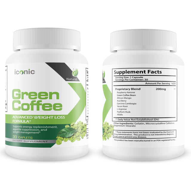 Iconic Green Coffee is a pure and natural supplement for men and women that has proven to be effective for weight loss and several other health benefits.Long known as one of the most potent natural appetite suppressants to ever exist, Green Coffee Bean can prevent harmful cravings that damage your dieting progress and keep you more disciplined. In addition to its appetite-controlling effects, Green Coffee Bean Extract also ramps up metabolic rate and increases the amount of fat you burn, a win-win for dieters looking for a dual solution. Not only does this product help you lose weight but it can also increase your overall health long term and the pure antioxidants within green coffee bean extract for weight loss can boost the immune system These pills can accelerate the function of adiponectin - this is the enzyme that helps to burn fat - enabling you to achieve your best physique you've always dreamed of. This supplement for both men and women can also change the effect that carbohydrates have on your internal system - it can keep insulin spikes under control and help to lower high blood sugar levels. Iconic Green Coffee Bean is an excellent way to kick start your weight loss journey paired with proper nutrition and exercise and the BEST part!? You can buyIconicGreen Coffee RISK FREE! We strive for complete satisfaction, if this is not achieved we will refund you 100% within 60 days of purchase, so what do you have to lose, besides unwanted weight?!