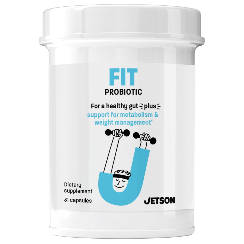 Jetson Health Weight Management Support Fit Probiotic Supplement, 17.5 Billion CFU, 31 ct, is a unisex probiotic formulated with studied probiotic strains that supports healthy fat metabolism, boosts a healthy exercise regimen, and reduce bloating.* Jetson’s Fit Probiotic contains 17.5 billion CFU of the following strains: Bacillus subtilis DE111®, Lactobacillus acidophilus NCFM, Bifidobacterium lactis Bl-07, Bifidobacterium lactis B420, Bacillus coagulans, Lactobacillus fermentum Lf61. All Jetson Health formulations are tested for purity and potency. Our Fit probiotic blend is developed with delayed-release capsule technology to help the probiotics survive and make it into your gut. Each of our products promote a healthy digestive environment and overall gut health.* Probiotics are live bacteria and yeasts that supports gut balance and overall gut health.*