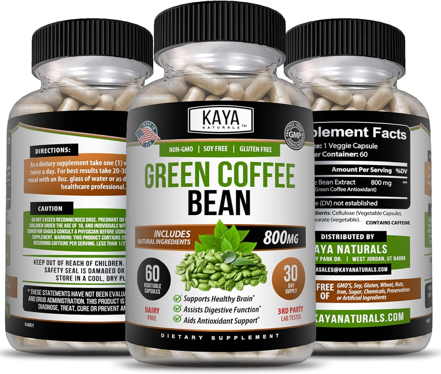 ENERGY BOOSTEROur non-GMO supplement helps you better control your eating habits and aids digestion. It also enhances your energy levels so you get enough to get through busy days. | ALL-NATURAL GOODNESSOur green coffee bean extract capsules contain natural and vegetarian-friendly ingredients. They also contain powerful antioxidants that can protect you from harmful free radicals. | QUALITY AND SAFETYKaya Naturals gives you only the highest quality natural ingredients and compounds in every capsule of our dietary supplements. We manufacture your Green Coffee Bean pills and put them through thorough quality testing to ensure that the ingredients are safe, pure, and potent before we deliver them to you. |