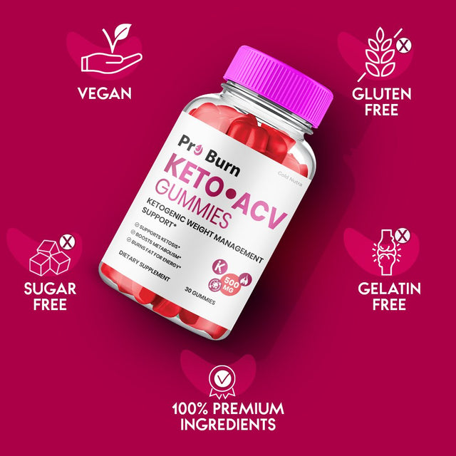 Official Pro Burn Keto ACV Gummies are made for weight management, energy, metabolism support, and more. Pro Burn keto gummies contain premium apple cider vinegar, keto plus acv. 1 Bottle contains 1 month supply. 30 gummies per bottle. 1 gummy per serving . Maximum Strength supplement with Premium Apple Cider Vinegar, Vitamin B12, Pomegranate and Beet Root Powder. Made in the USA in a GMP certified facility. These maximum strength gummies are gelatin free, gluten free, made with no artificial colors or flavors, allergen free and Non-GMO. This is the Official ProBurn Keto ACV Gummies.