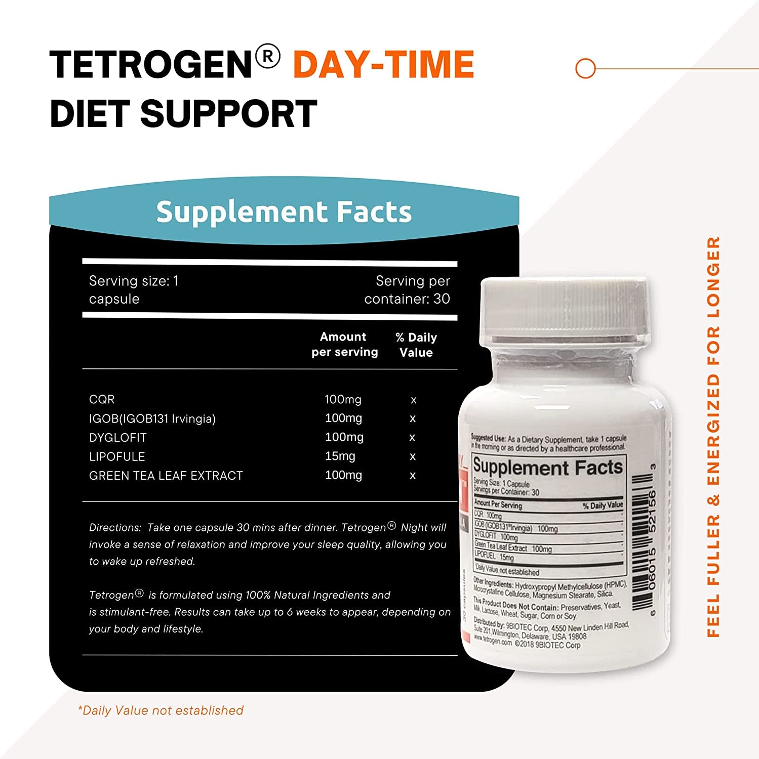 Tetrogen is Formulated with four clinically studied and patented active ingredients to Help Reverse Leptin Resistance for Long Term Weight Management. Tetrogen is formulated to be taken in conjunction with a calorie-restricted diet and exercise regimen to help gradually transition to a healthier diet and lifestyle.