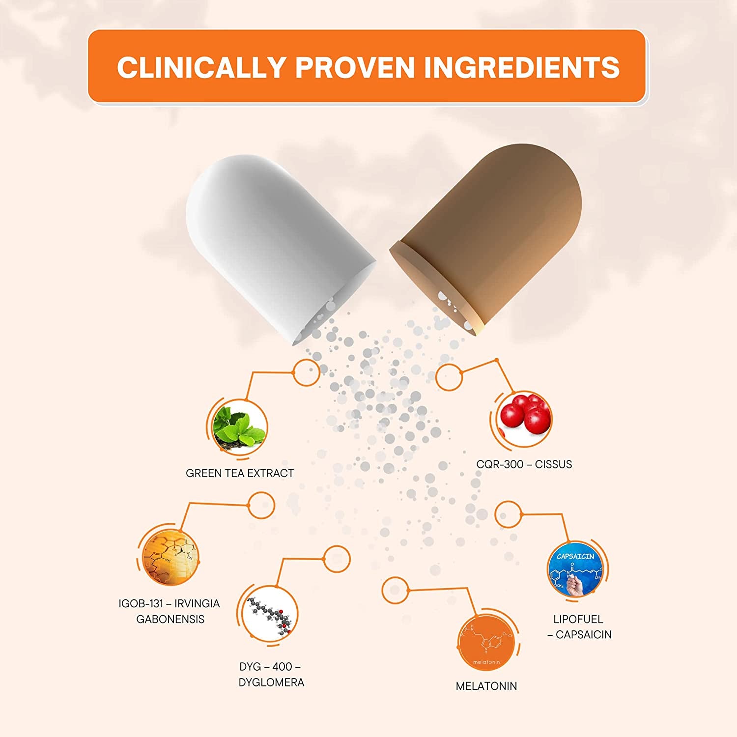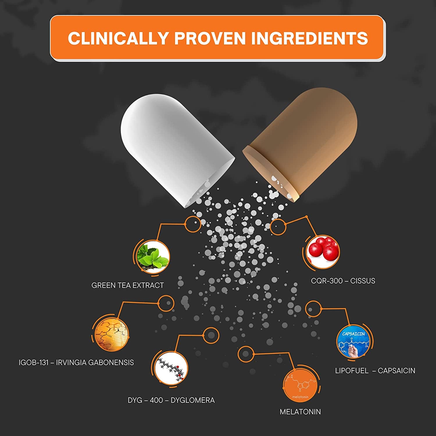 - Key weight Management ingredients: Scientific blend of 4 Clinically patented ingredients -IGOB 131 (Extract of African Mango), CQR-300 (Cissus), DYG-400 (Dyglomera), Lipofuel PLUS includes Green Tea extract