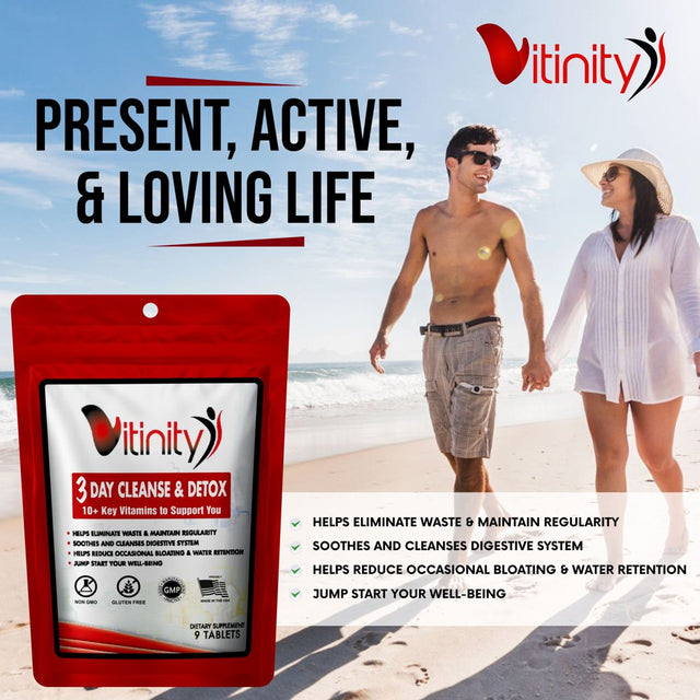 WHOLE BODY HERBAL DETOX -- Vitinity s 3-Day cleanse and detox system contains cutting edge herbal ingredients that have been shown to help cleanse the kidneys, liver, colon, and digestive system utilizing all-natural ingredients.,REDUCE BLOATING -- Reduce bloating and relieve occasional constipation with an advanced herbal cleanse and detox formula. Ingredients such as Aloe Vera, Senna Leaf, and Apple Cider Vinegar help reduce water retention and abdominal bloat.,COLON CLEANSE PILLS -- Vitinity s 3-Day Cleanse also contains probiotics to help cleanse the colon and support healthy bacteria formation in the lower intestine. This unique blend of herbal ingredients and probiotics helps keep a healthy functioning colon running great.,SUPPORT WEIGHT LOSS -- It s no secret that losing weight is hard. What makes it harder is a body that is backed up with toxins and isn t functioning at its best. A healthy functioning, detoxed liver can better support weight loss by churning through fatty acids as fuel.,CUTTING EDGE HERBS -- Utilizing proper doses of herbs such as Turmeric, Milk Thistle (Silymarin), Dandelion Root, and Cayenne Pepper, Vitinity s 3-Day Cleanse Supplement contains a unique blend of all-natural earth found ingredients.