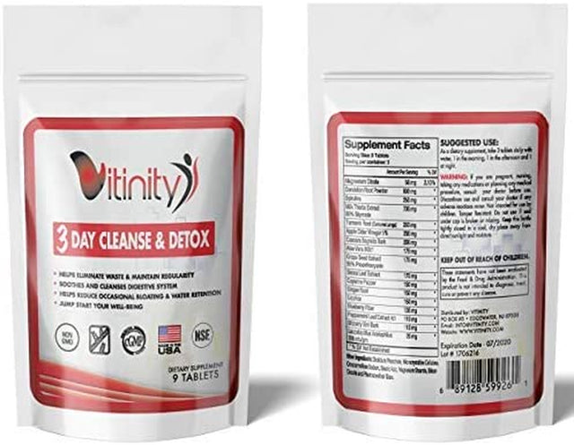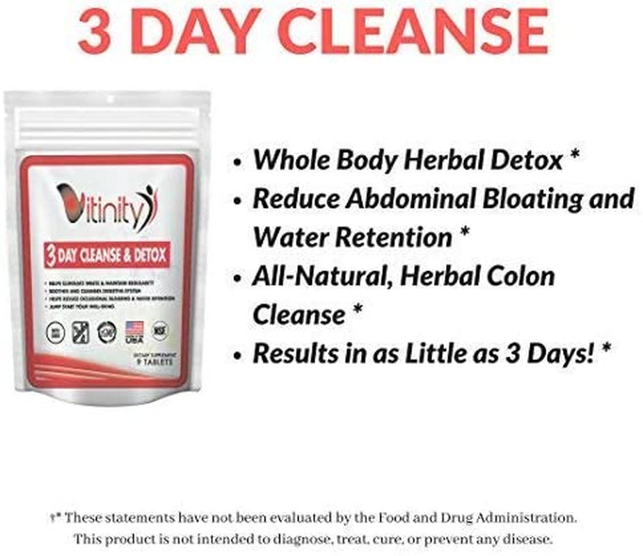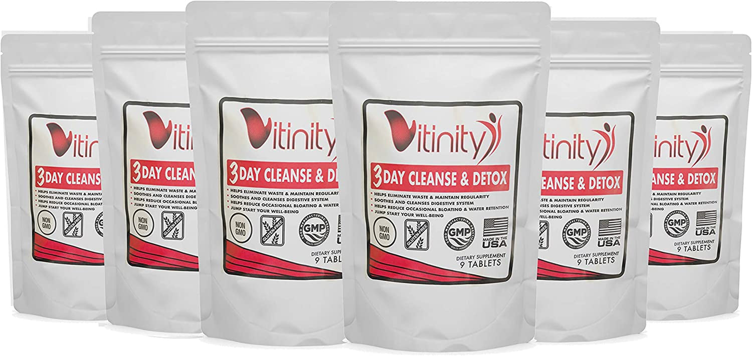 • WHOLE BODY HERBAL DETOX -- Vitinity’s 3-Day cleanse and detox system contains cutting edge herbal ingredients that have been shown to help cleanse the kidneys, liver, colon, and digestive system utilizing all-natural ingredients.