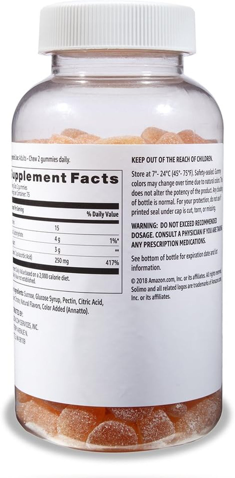 Amazon Brand - Solimo Vitamin C 250mg, 150 Gummies (2 Gummies per Serving)