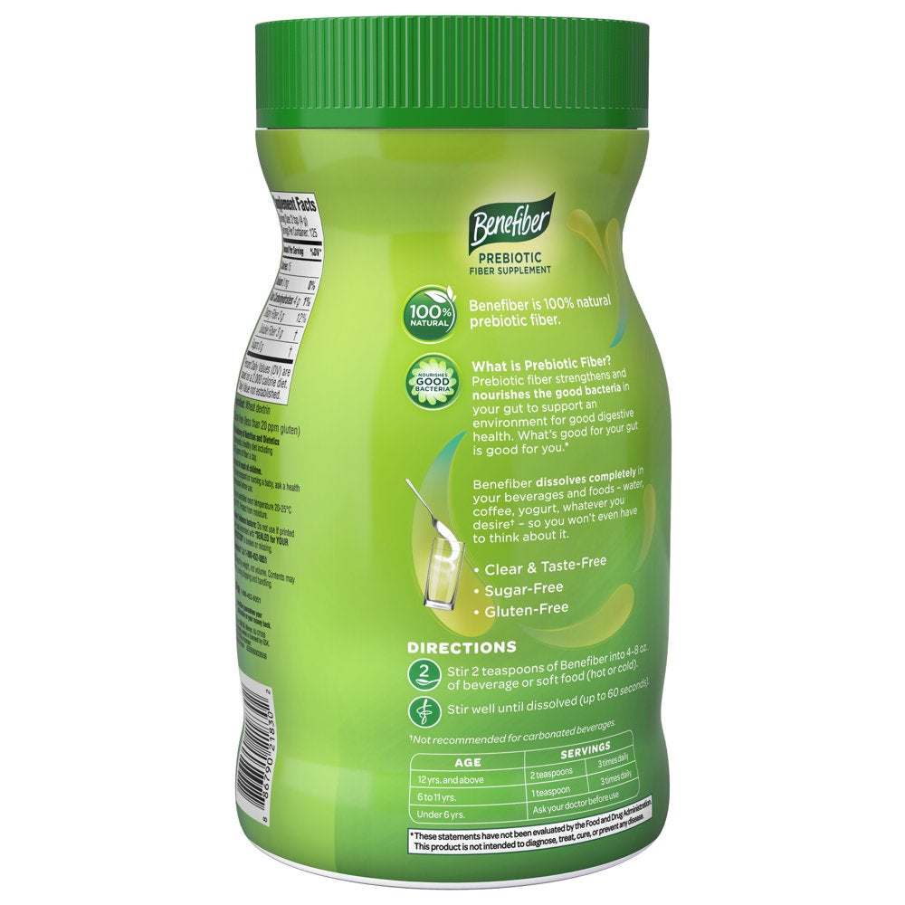 Benefiber Daily Prebiotic Fiber Powder provides the daily fiber you need to maintain good digestive health in a sugar and gluten free unflavored fiber powder form. This fiber supplement nourishes the good bacteria in your gut with wheat dextrin, supporting an environment for good digestive health.(1) Taste and grit free, this fiber powder dissolves completely in foods and beverages like water, coffee or juice, so you can enjoy all the benefits of prebiotic supplements in a variety of foods and beverages.(2) For ages 12 and older, stir two teaspoons of Benefiber prebiotic fiber supplement powder into four to eight ounces of a non-carbonated beverage or soft food three times daily. For children ages 6 to 11, use one teaspoon of this powder three times daily. What's good for your gut is good for you. (1) These statements have not been evaluated by the Food and Drug Administration. These products are not intended to diagnose, treat, cure or prevent any disease. (2) Not recommended for carbonated beverages. (3) The wheat has been processed to allow this food to meet the Food and Drug Administration (FDA) requirements for gluten-free foods. Use as directed.