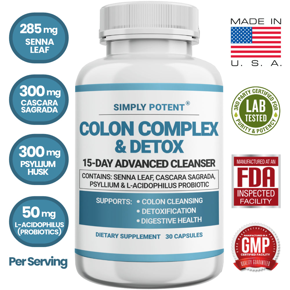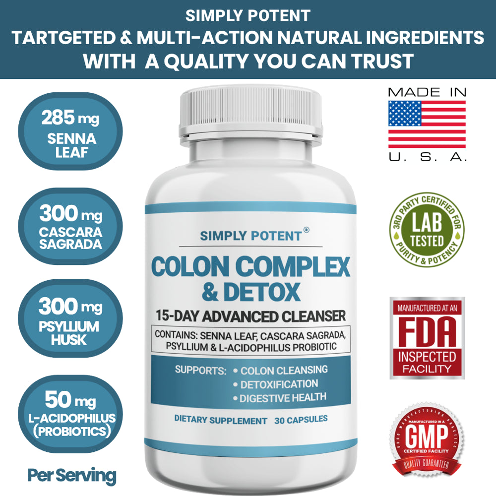 ★ POWERFUL NATURAL LAXATIVES FOR CONSTIPATION RELIEF - Each serving of Simply Potent Colon Complex Capsules contain 285 mg of Senna Leave & 300 mg of Cascara Sagrada which are very popular herbal laxatives. Senna Leaf Extract is an FDA-approved nonprescription laxative. It is used to alleviate constipation and also to clear the bowel before diagnostic tests such as colonoscopy.*
