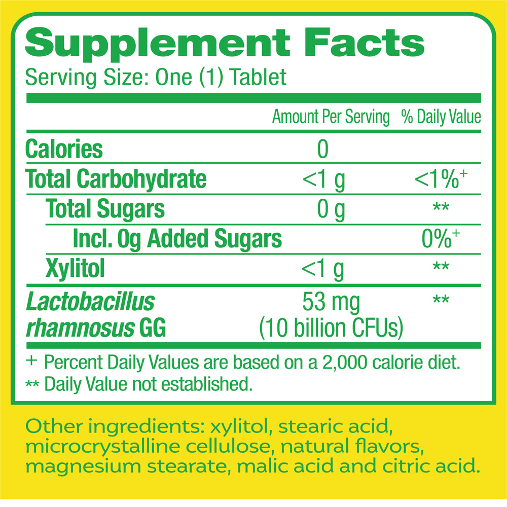 Culturelle Probiotics Digestive Daily Probiotic Chewable Tablets contain billions of live active cultures of Lactobacillus rhamnosus GG, the most clinically studied probiotic strain† for clinical strength immune support.* These digestive support chewables safely and naturally restore the balance of good bacteria in your digestive tract, where 70% of the body's immune system resides.* Balancing this bacteria not only promotes a strong and healthy gut, but it also helps your digestive system work better and helps reduce occasional gas, bloating, and diarrhea.*