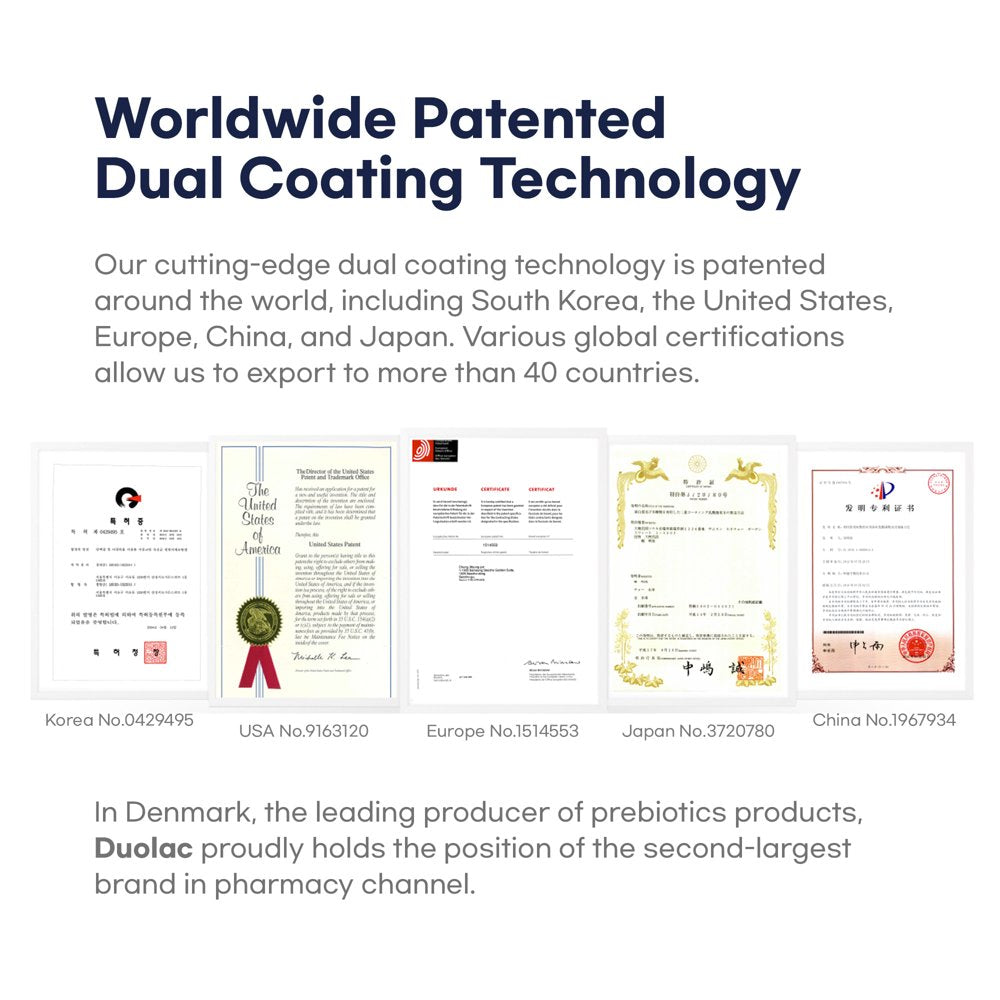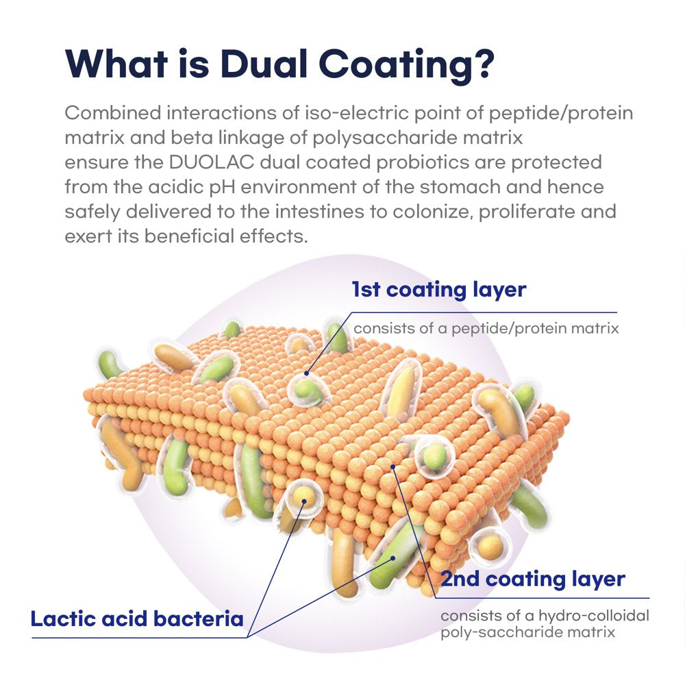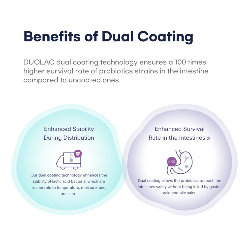 Patented Dual Coating Technology: Experience the innovation of our patented dual coating, designed to protect the probiotics through the digestive journey and 10 billion CFUs are guaranteed to reach the gut alive.