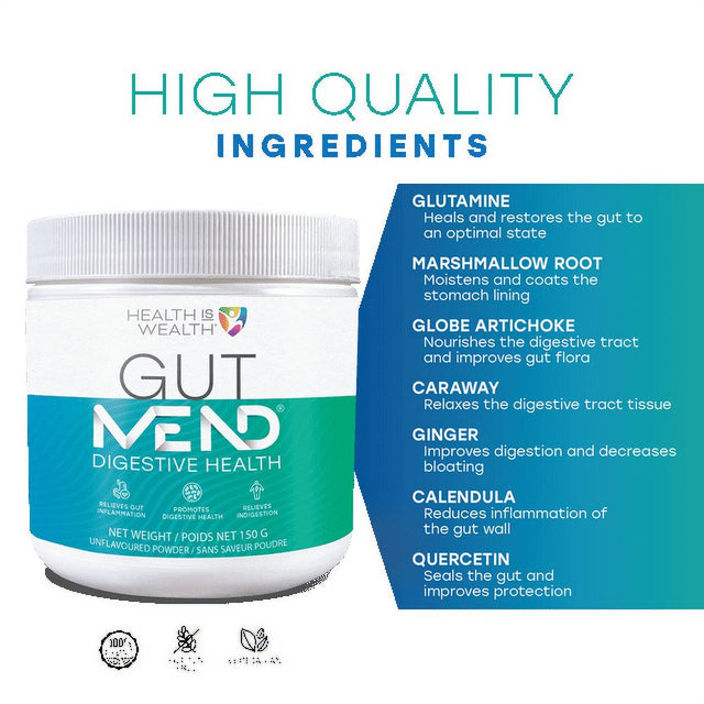 - MADE IN CANADA: Health IS Wealth GutMEND supplement is exclusively manufactured in an accredited and Health Canada licensed, good manufacturing practice (GMP) certified facility. Our advanced digestive health powder is a safe natural health product and contains an effective 5 gram dose per serving (150 g total per container). 30 day supply. It is vegetarian, gluten free and contains organic ingredients.