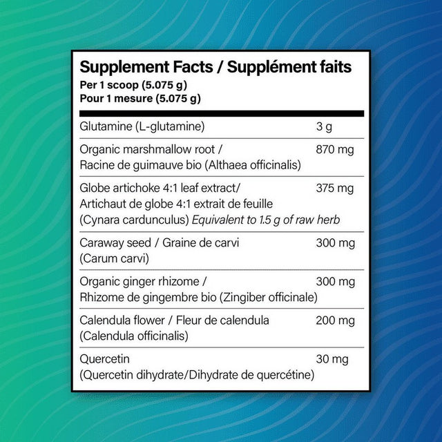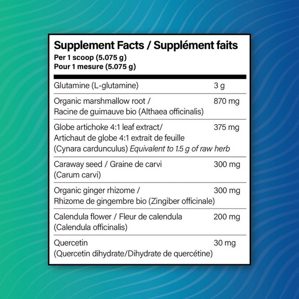 - RELIEVES GUT INFLAMMATION: Our product contains a natural amino acid, herbal and flavonoid ingredient formulation consisting of glutamine, organic marshmallow root, artichoke, caraway, organic ginger, calendula and quercetin. GutMEND powder moistens the mucous membranes and coats the stomach lining absorbing toxins and combating inflammation in the tissue. It is effective for healing the gut lining for those suffering from inflammatory bowel disease (IBS, Crohn's, Ulcerative colitis).