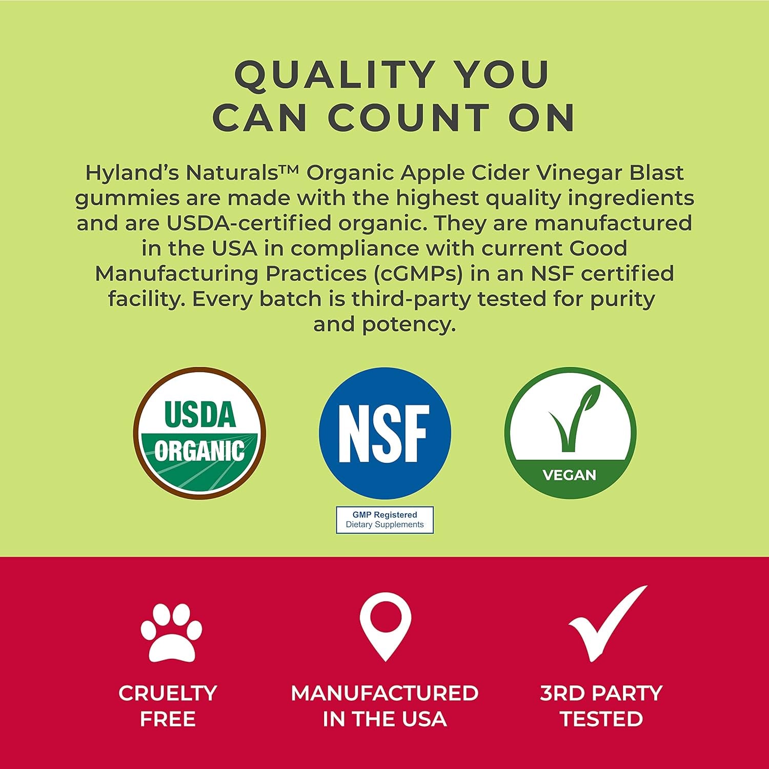 Superpowered antioxidant apple cider vinegar without the lip puckering. Hyland’s Naturals Organic Apple Cider Vinegar Blast supports your digestive and gut health in tasty vegan, easy-to-chew gummies that are USDA-certified organic, pectin-based and packed with 500 mg of apple cider vinegar per serving — without the bitter aftertaste. Hyland’s Naturals Organic Apple Cider Vinegar Blast gummies are free of soy, milk, peanuts, tree nuts, wheat, gluten, fish, shellfish, egg, sesame, gelatin, high-fructose corn syrup, added preservatives, yeast, salicylates and artificial stuff (synthetic colors, flavors, sweeteners). Hyland’s Naturals gummies are made with high quality ingredients and manufactured in the USA in NSF certified facilities, fully compliant with current Good Manufacturing Practices (cGMPs). *These statements have not been evaluated by the Food and Drug Administration. This product is not intended to diagnose, treat, cure, or prevent any disease.