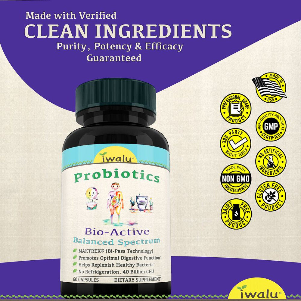 iwalu Balanced Spectrum Probiotics: Digestive, Immune Health, and more The perfect daily balance complex for your digestive health, immune support, cognitive function, and weight control - supplying powerful support, especially for low carb ketogenic diets. Our daily probiotics / prebiotics for women and men harness MAKTREK Bi-pass technology so that they survive stomach acid and bile to deliver full effectiveness where they are needed most. Weight management and Anti Bloating Relief for Women & Men How can a balance complex with pre and probiotics for women and men help me manage weight? Taking probiotics for digestive health can play a key role in our metabolism and belly fat control. In addition to healthy diet and exercise, these raw probiotics pills are a smart tool for staying slim and fit plus helping counter discomfort and bloating. Powerful Immune Support Supplement With over 70% of immune system cells in the gut, our digestive enzymes with probiotics and prebiotics put good bacteria where you need it! They're packed with clinically studied strains (plus FOS) for maximum benefit. Prebiotics paired with probiotics help restore digestive harmony and a healthy immune response. Feminine Health - Womens Probiotic for Ph balance and Cleanse Ladies, rejoice! These expert formulated probiotics for women 50 billion help with feminine health too. Multiple studies show oral probiotics with acidophilus lactobacilli bifidobacterium strains naturally migrate south to restore Vaginal Ph balance and comfort. Cognitive Support Age gracefully - Probiotics help support digestive function which in turn supports the gut brain connection to improve cognition. iwalu formulas come in easy-to-swallow, vegetarian capsules. Try iwalu daily probiotics for adults and kids today!