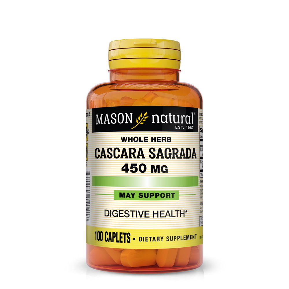 • Mason Natural Cascara Sagrada contains 450 mg of cascara sagrada in a once a day caplet which may help support normal digestive health and reduce the likelihood of constipation.