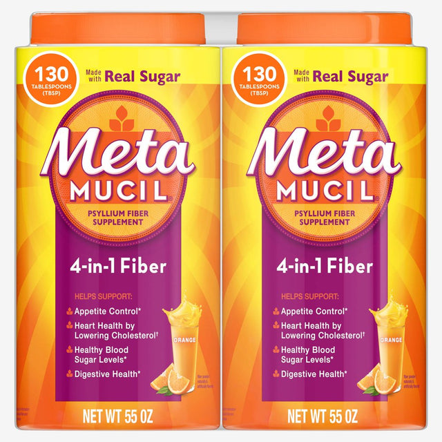 Feeling sluggish and weighed down? It could be a sign that your digestive system is not working at it's best. Try Metamucil Daily Psyllium Fiber supplements from the #1 selling fiber brand^. Metamucil Daily Psyllium Fiber Powder, Real Sugar, Orange Flavored traps & removes the waste that weighs you down*, so you can feel lighter and more energetic**. It also helps you control appetite*, maintain healthy blood sugar levels*, and supports heart health by lowering cholesterol. Lighten every day the Metamucil way!The digestive system is important to the overall health and wellbeing of the body. That's why it's key to support your gut health every day by giving it all the nutrients it needs. One nutrient-fiber-plays a key role in your digestive health, keeping the digestive system working at its best. But only 10% of Americans get enough fiber in their regular diet every day. The good news? Metamucil fiber supplement can help close the fiber gap. Diets low in saturated fat and cholesterol that include 7 grams of soluble fiber per day from psyllium husk, as in Metamucil, may reduce the risk of heart disease by lowering cholesterol. One adult serving of Metamucil Powder has 2.4 grams of this soluble fiber. *THESE STATEMENTS HAVE NOT BEEN EVALUATED BY THE FOOD AND DRUG ADMINISTRATION. THIS PRODUCT IS NOT INTENDED TO DIAGNOSE, TREAT, CURE, OR PREVENT ANY DISEASE.^Procter & Gamble calculation based in part on data reported by NielsenIQ through its ScanTrack Service for the Fiber Supplements (branded only) for the 52-weeks period ending 04/09/22, for the Total U.S. Market xAOC, according to the NielsenIQ standard product hierarchy. Copyright 2022, Nielsen Consumer LLC.