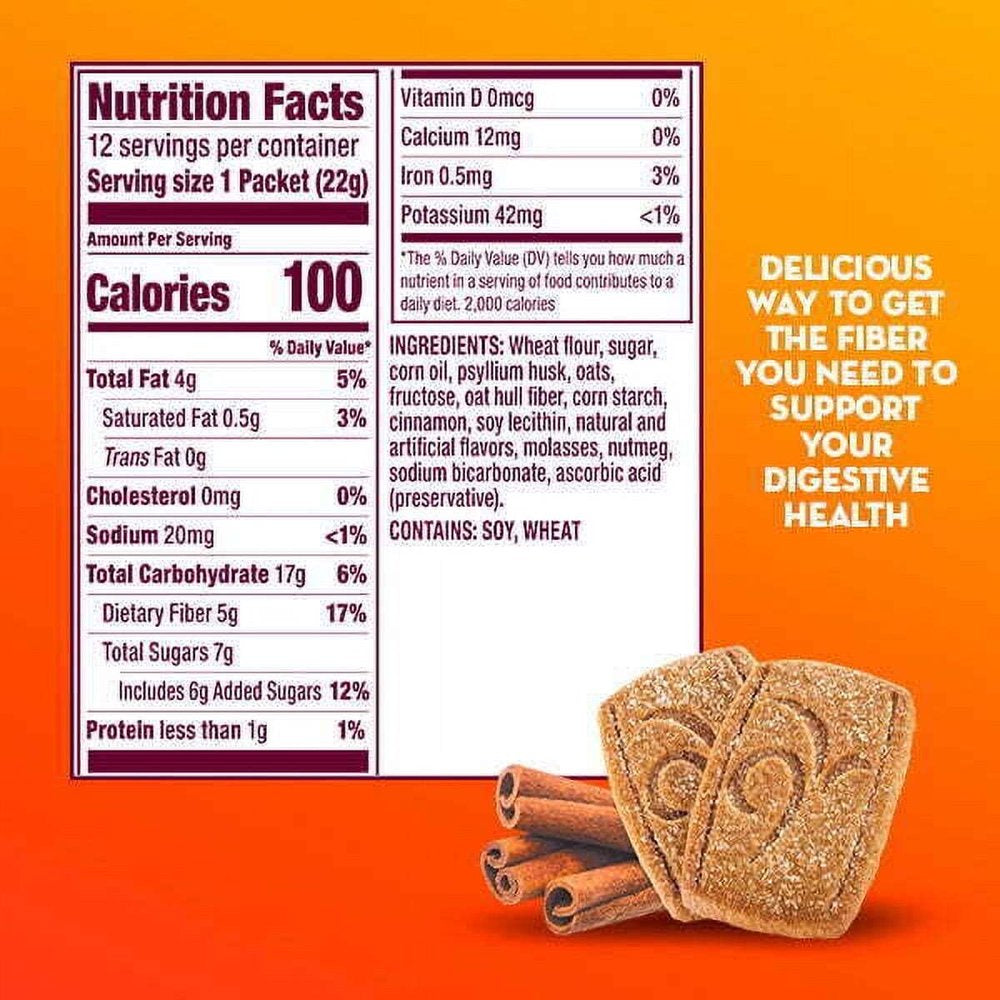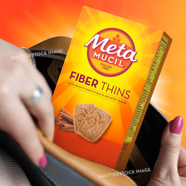 Metamucil Cinnamon Spice Fiber Thins 12 count are a delicious fiber snack. Each 2 thin serving provides 5 grams of fiber with just 100 calories and 4 grams of total fat per serving. Metamucil Cinnamon Spice Fiber Thins help to satisfy hunger and contain 15% of your daily recommended value of fiber to help support your digestive health*. Metamucil Cinnamon Spice Fiber Thins are perfect for taking your fiber with you on-the-go. Metamucil Fiber Thins contain psyllium husk fiber are individually wrapped and are perfect to pack for a day out, for a lunchtime snack, or for travel. Metamucil Fiber Thins comes in three different flavors, cinnamon spice, chocolate and apple crisp - pick your favorite flavor and enjoy your daily fiber supplement. Trusted by professionals, Metamucil is the #1 doctor recommended fiber brand and the #1 Selling Fiber Brand^. The digestive system is important to the overall health and wellbeing of the body. That's why it's key to support your gut health every day by giving it all the nutrients it needs. One nutrient-fiber-plays a key role in keeping the digestive system working at its best. But only 10% of Americans get enough fiber in their regular diet every day. The good news? Metamucil can help close the fiber gap. ^Procter & Gamble calculation based in part on data reported by Nielsen IQ through its Scan Track Service for the Fiber Supplements (branded only) for the 52-weeks period ending 04/09/22, for the Total U.S. Market xAOC, according to the NielsenIQ standard product hierarchy. Copyright 2022, Nielsen Consumer LLC. *THESE STATEMENTS HAVE NOT BEEN EVALUATED BY THE FOOD AND DRUG ADMINISTRATION. THIS PRODUCT IS NOT INTENDED TO DIAGNOSE, TREAT, CURE, OR PREVENT ANY DISEASE.