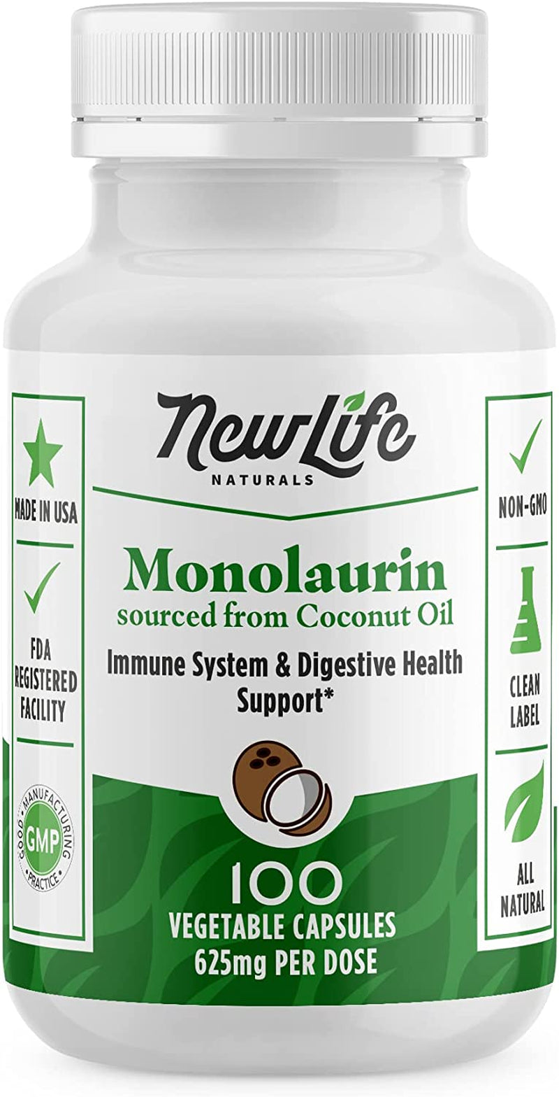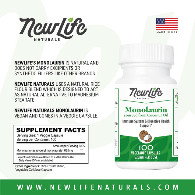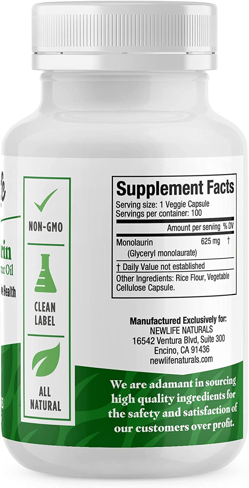 Newlife Naturals Monolaraurin Dietary Supplement - 625Mg Monolaurin Lauric Acid for Immune System and Digestive Health - 100 Vegetable Capsules
