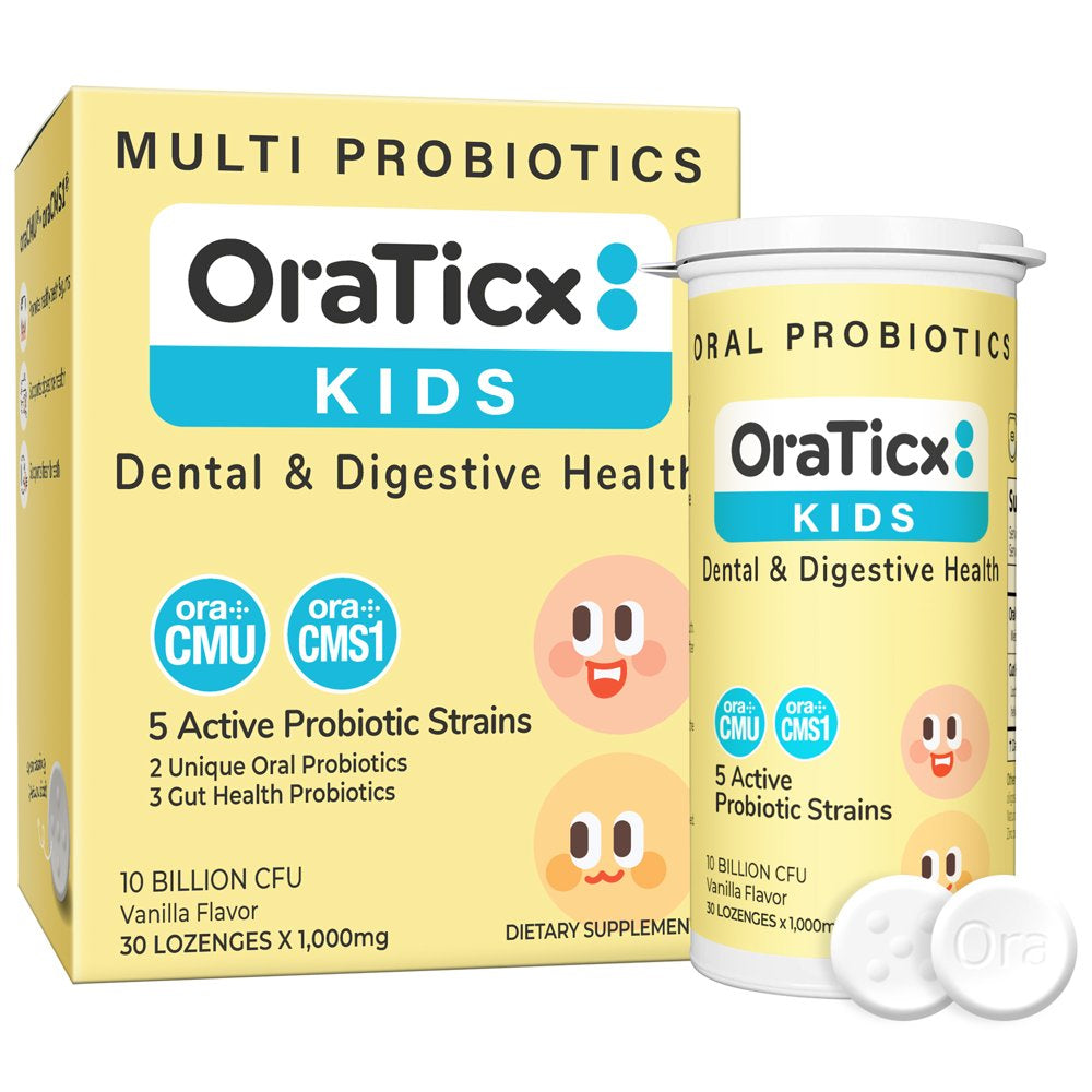 Oraticx Kids Multi Probiotics for Dental & Digestive Health, Naturally Supports Oral Care, Digestion, Immunity, 10 Billion CFU 5 Active Probiotic Strain, Vanilla Flavor 30 Lozenges 1-PK
