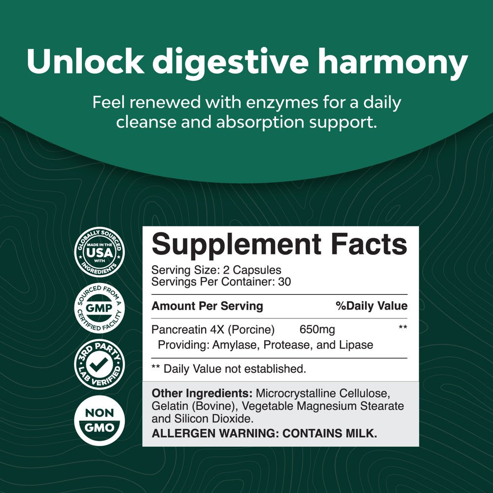 • Pancreatin 4X - This proven combination of pure digestive enzymes for pancreas support and digestive health helps break down the main building blocks of food to keep your body functioning at its best