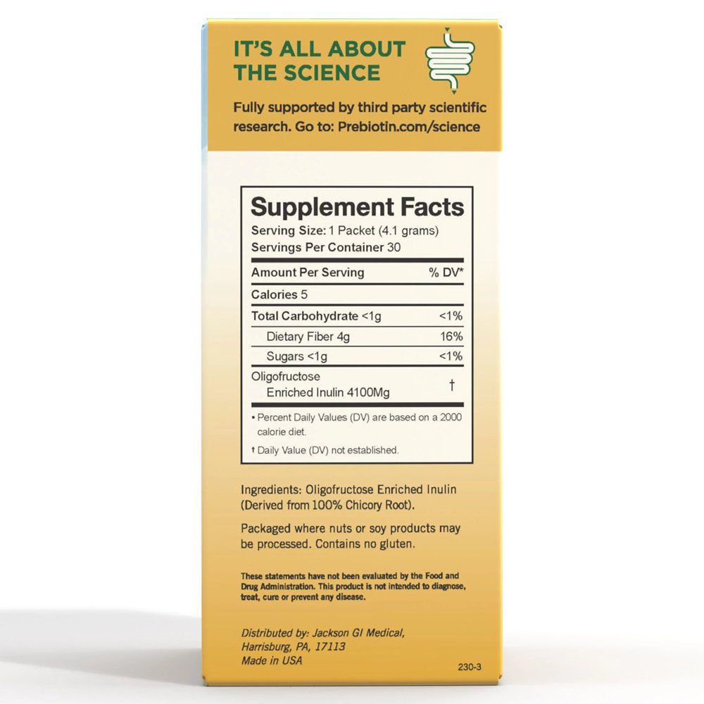 Same great Prebiotin Premier Prebiotic Fiber in convenient 4.1 gram Stick Packs. 30 Servings Per Box. Convenient for traveling or taking to work. Never be without your Prebiotin again! Each stick pack has a single 4.1 gram daily dose of Prebiotin Premier Prebiotic Fiber, which nourishes digestive health, boosts immunity, increases calcium absorption and provides many other health benefits. It is natural, gluten-free and mixes easily with any food or beverage. Stick packs are ideal for the person on the go. 30 packets. 30 day supply at our recommended minimum of 4.1 grams daily.