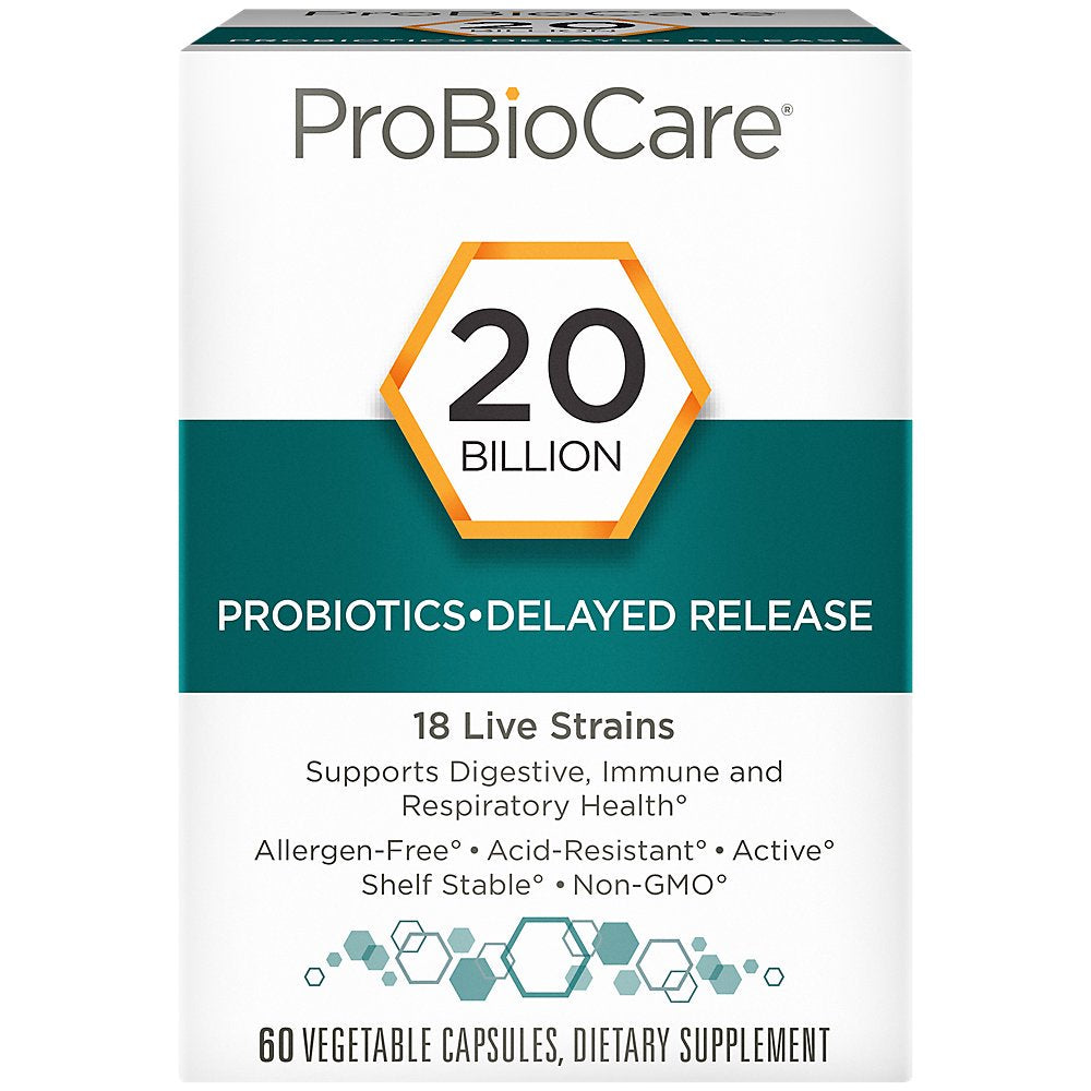 Each delayed-release, allergen-free vegetable capsule is acid-resistant to ensure these probiotics are protected from the harsh, acidic environment of your stomach. Frequently Asked Questions What are CFUs? CFUs, or colony forming units, are units of measurementthat express the potency of a probiotic. What exactly is a microbiome? A microbiome is a community of microorganisms that live together in a particular habitat. For example, your gut microbiome is comprised of bacteria, viruses, and other organisms that contribute to nutrient absorption, digestion, and directly impact your overall health. What is a desiccant-lined bottle and why is it important? A desiccant is a material that absorbs moisture. ProBioCare products have a desiccant-lined bottle to protect the probiotics from exposure to heat, light, and moisture, which can result in degradation and potency reduction. This also eliminates the need for refrigeration.