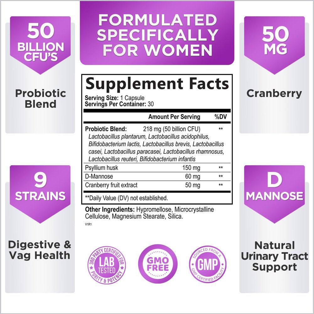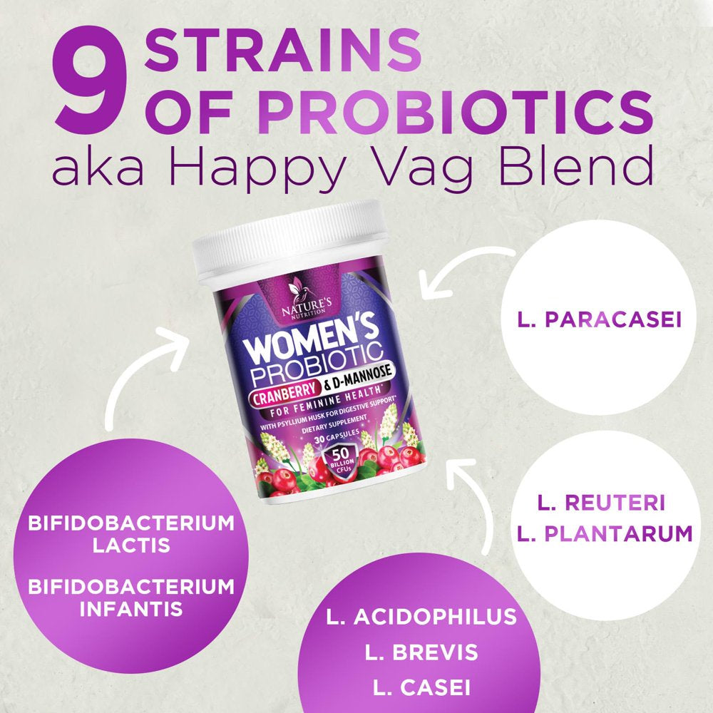 - Probiotics for Women: Our probiotic is designed specifically for feminine health & overall digestive health. 6 diverse strains, Cranberry & D-Mannose provide you with the natural feminine support