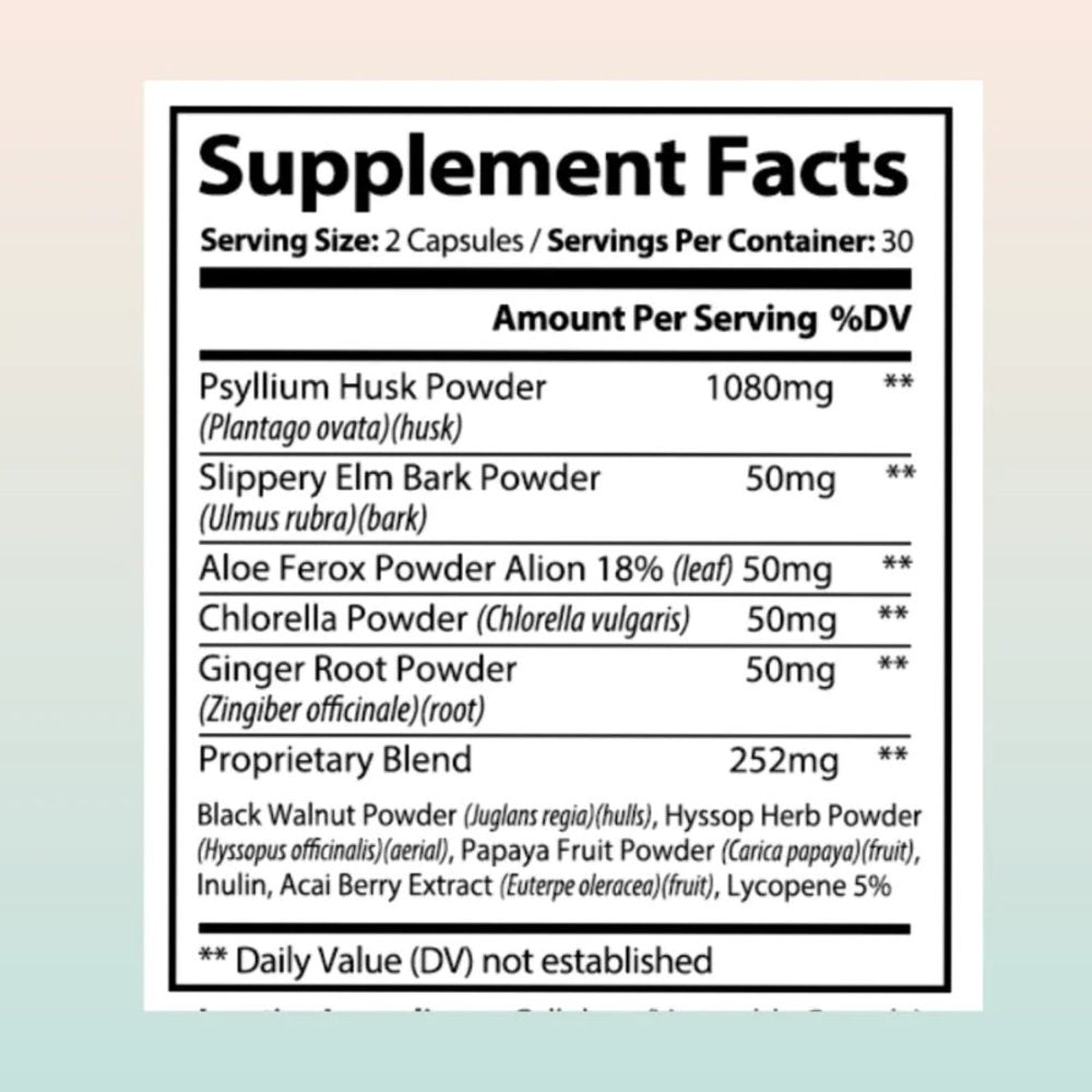 - Premium Ingredients: Psyllium Husk Powder (Plantago ovata) (husk), Slippery Elm Bark Powder (Ulmus rubra) (bark), Aloe Ferox Powder Alion 18% (leaf), Chlorella Powder (Chlorella vulgaris), Ginger Root Powder (Zingiber officinale) (root), Proprietary Blend: Black Walnut Powder (Juglans regia) (hulls), Hyssop Herb Powder (Hyssopus officinalis) (aerial), Papaya Fruit Powder (Carica papaya) (fruit), Inulin, Acai Berry Extract (Euterpe oleracea)(fruit), Lycopene 5%.