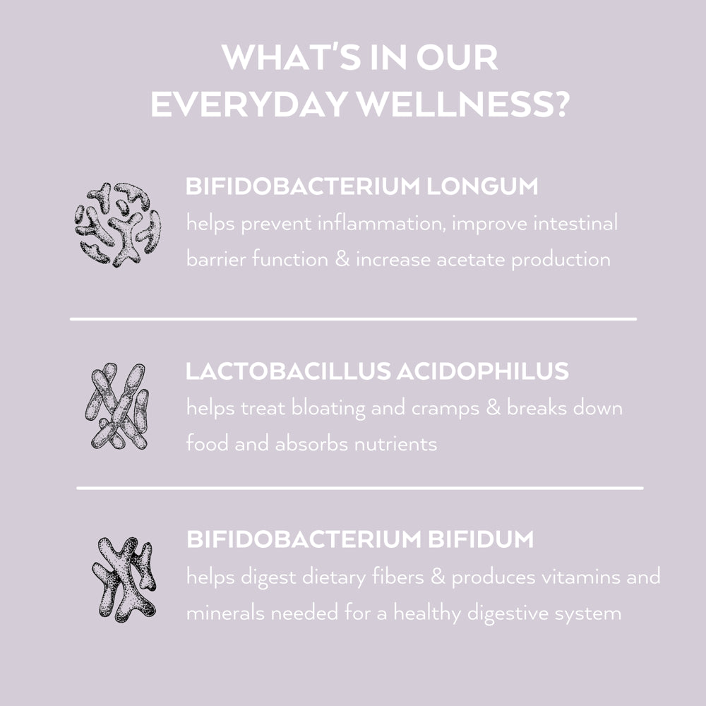 - POWERFUL INGREDIENTS: Everyday Wellness is a food supplement containing a blend of six beneficial bacteria including bifidobacteria, lactobacillus, and streptococcus PLUS FOS in an acid-resistant capsule shell for optimal effectiveness.