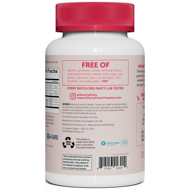 SmartyPants Adult Prebiotic and Probiotic Immunity Formula is AVA Certified Vegan, Non-GMO Project Verified and gluten-free. For every bottle sold, we make a 1 for 1 nutrient grant to Vitamin Angels to help get life-changing nutrients to mothers and children in need around the world.